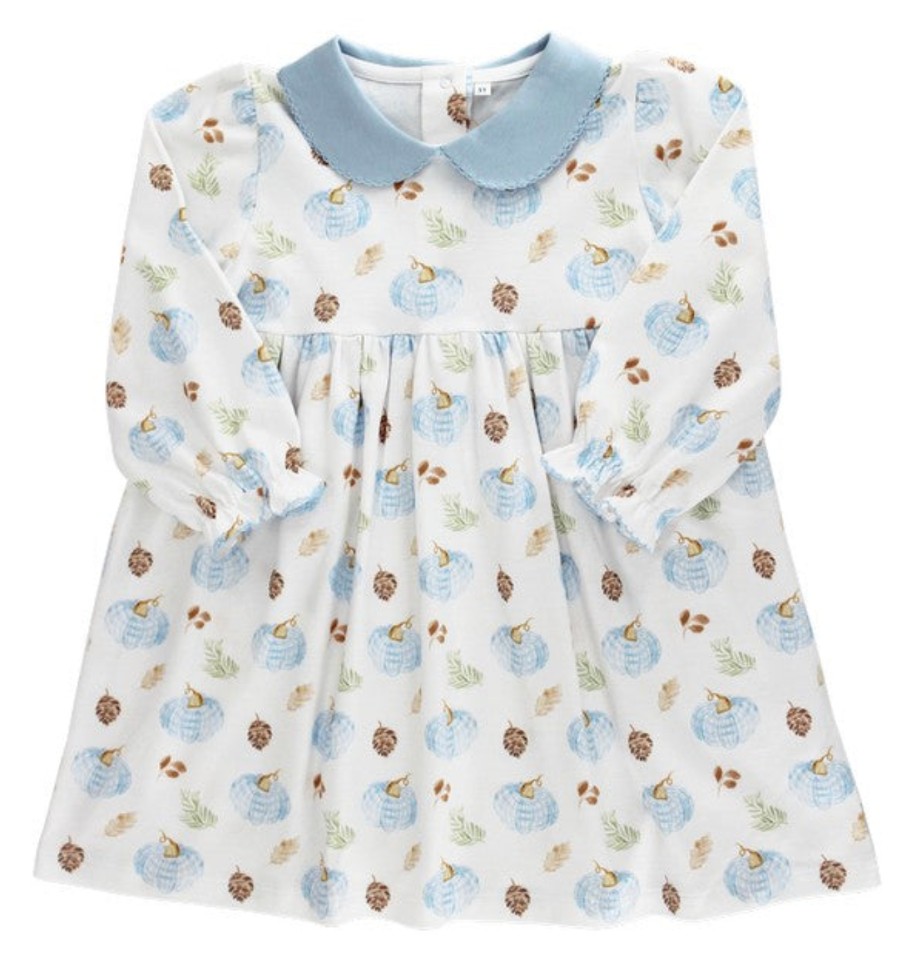Sweet and seasonal, this knit dress features a blue pumpkin and autumn leaf print with a peter pan collar. Perfect for school, church, or fall photos.