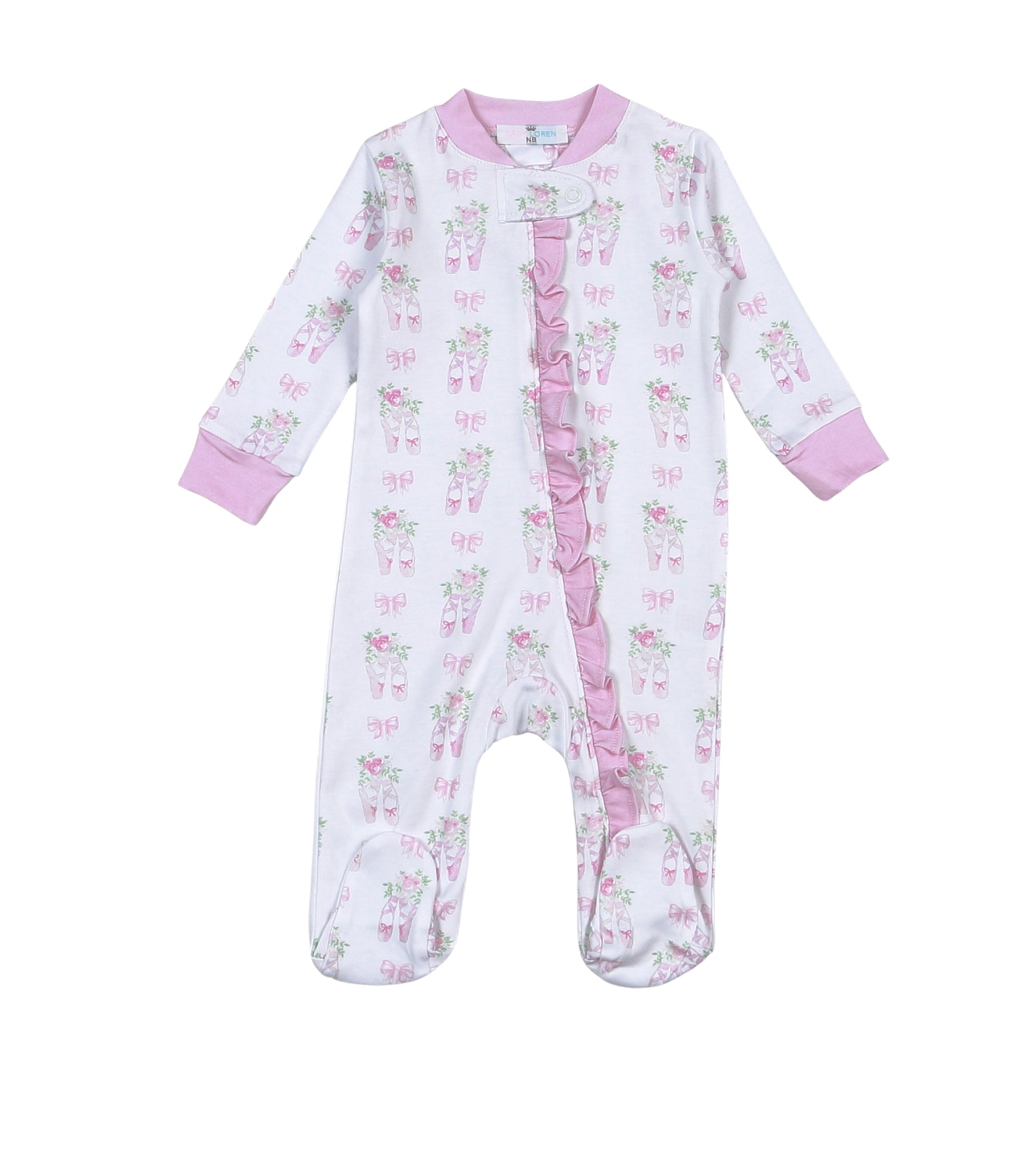 Sweet dreams start here! This cozy footie is covered in a charming allover print of pink ballet slippers tied with bows and filled with flowers. A soft ruffle detail runs along the asymmetrical snap closure, adding an extra touch of sweetness. With pink trim at the collar and cuffs plus built-in footies, this one-piece is perfect for keeping your little ballerina snug and stylish.
