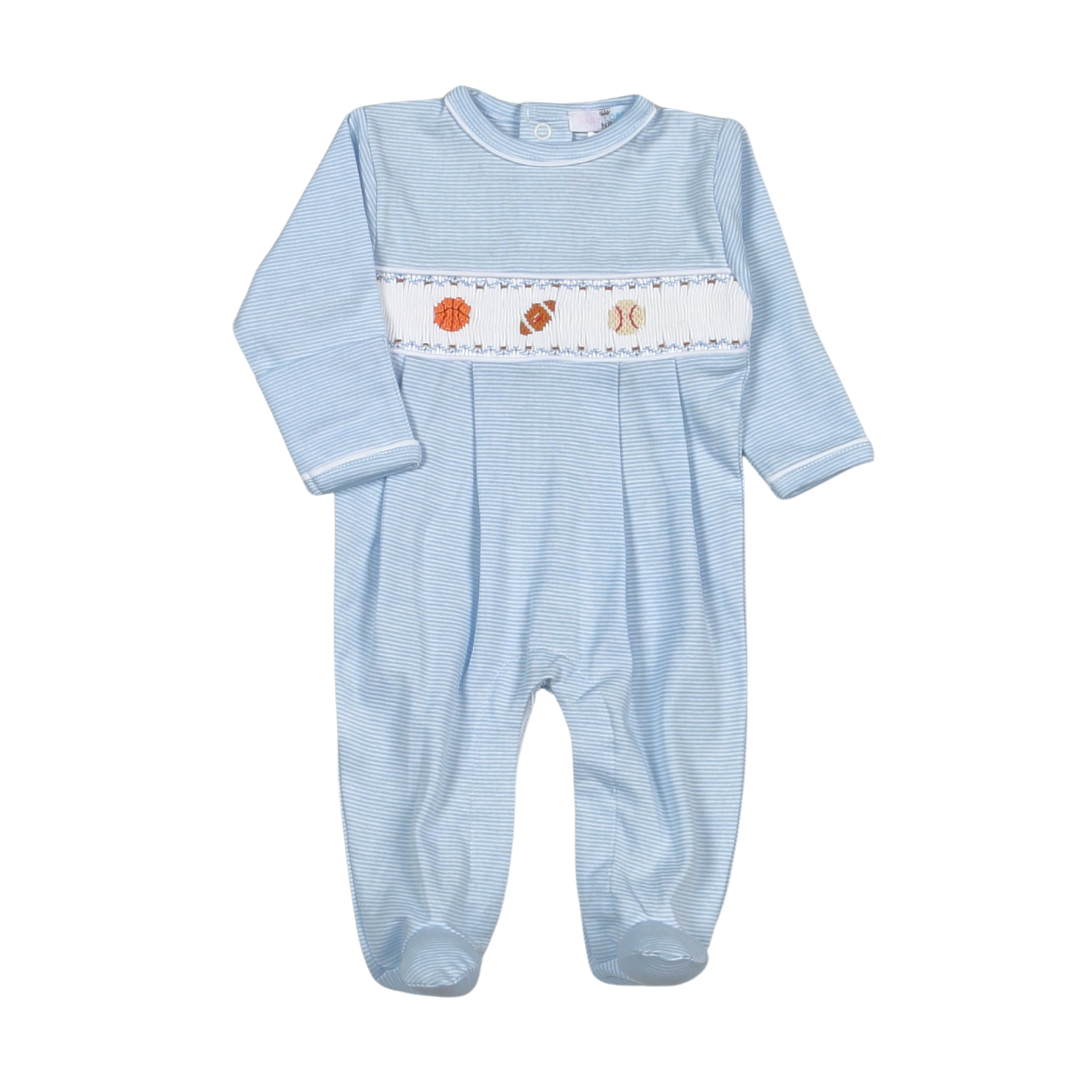 Dress your little MVP in this sweet blue striped romper, featuring hand-smocked sports balls across the chest. Made from soft, breathable cotton, this long-sleeve footed romper keeps baby cozy while adding a classic, playful touch. Perfect for everyday wear, baby showers, or game-day photos. Easy snap closures make changing time quick and simple. Made from 100% Peruvian Pima Cotton.