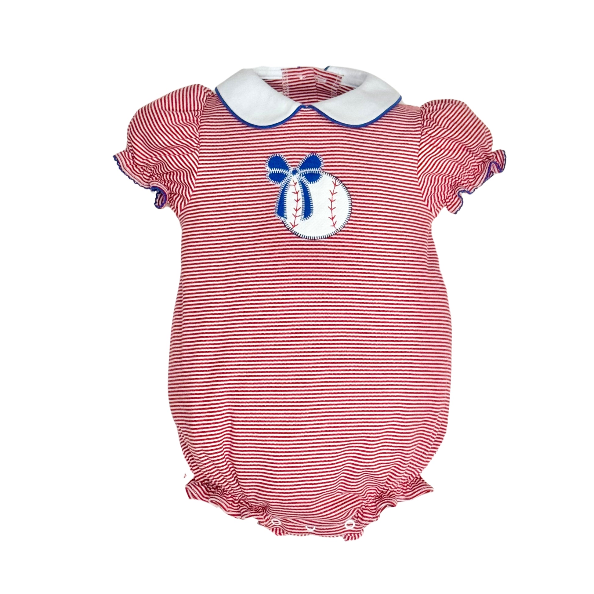 This girl bubble comes in a mini-red stripe soft fabric with an embroidered baseball motif, and made with snaps for easy dressing. It has the perfect details to put a girly spin on America's pastime. It is cute, comfortable, and summer-time ready!