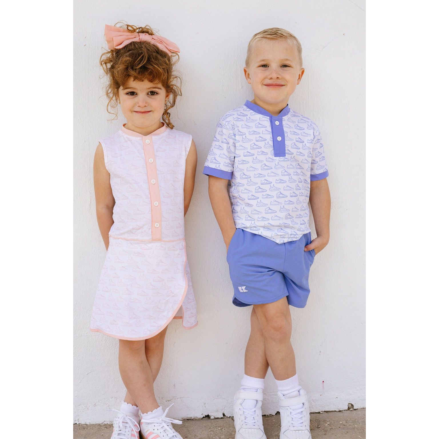 Courtside Kids clothing is one of a kind. The blade collar shirt will take your kids to school, sports, and everything in between. Featuring a fun blue sneaker print on an athletic feel shirt. It pairs perfectly with Courtside Kids blue shorts.
