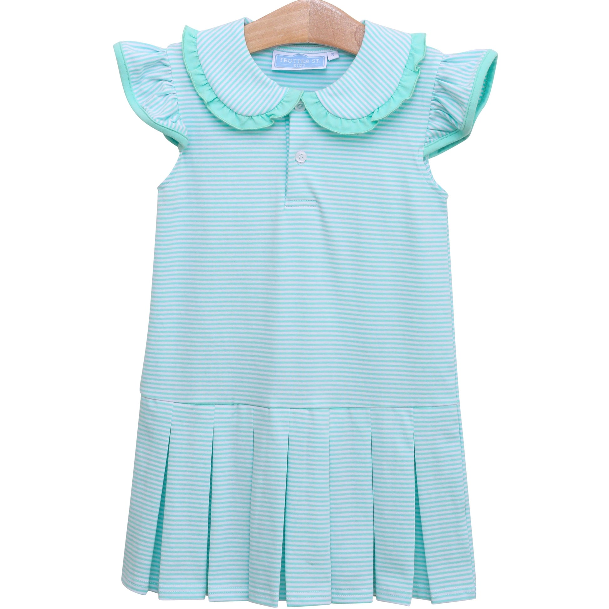 This girls dress features a mint stripe knit with flutter sleeves, a ruffle-trim Peter Pan collar, and a pleated skirt. Soft, comfortable, and easy to wear, it’s perfect for everyday outfits, school days, and special occasions.