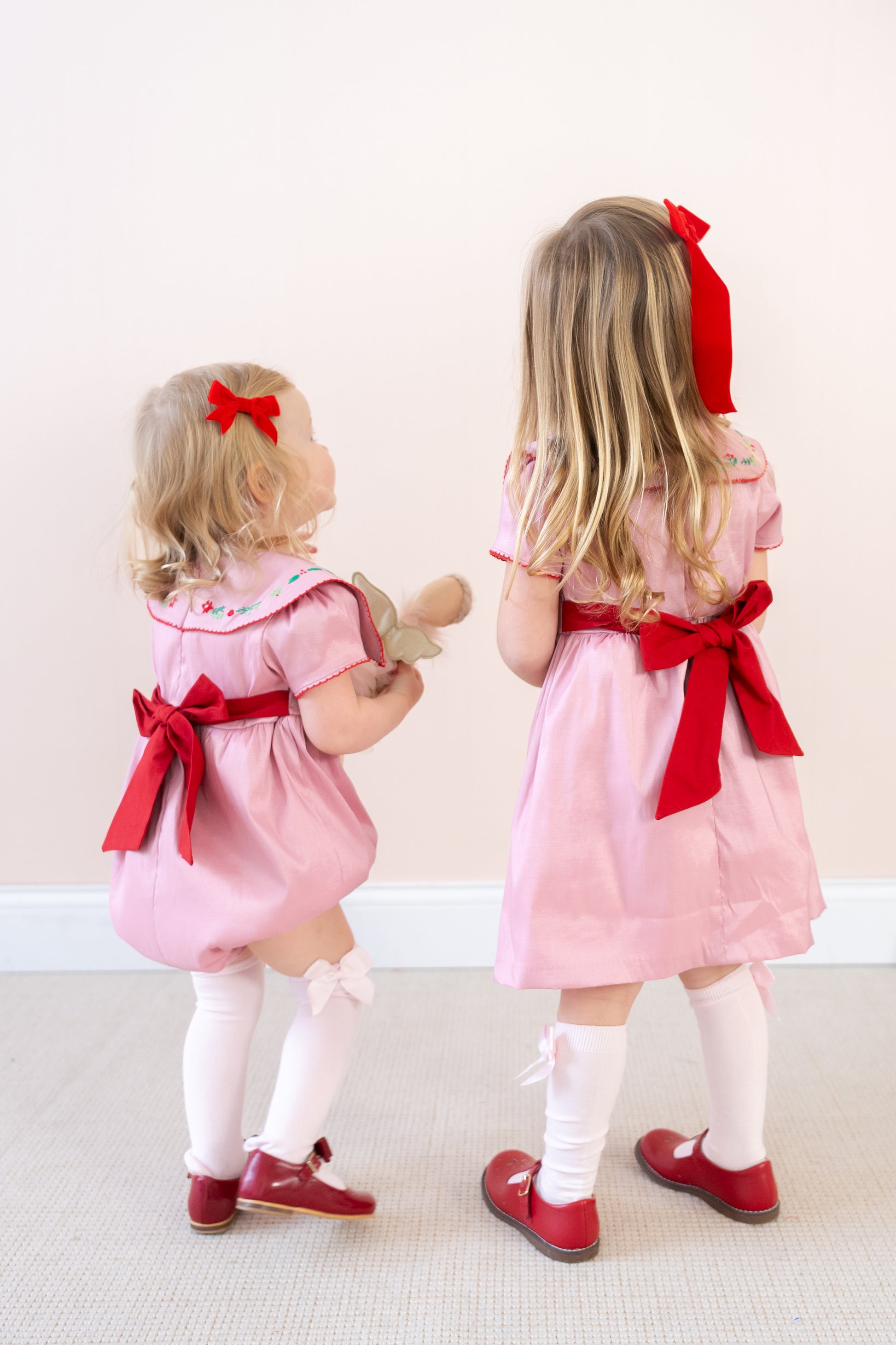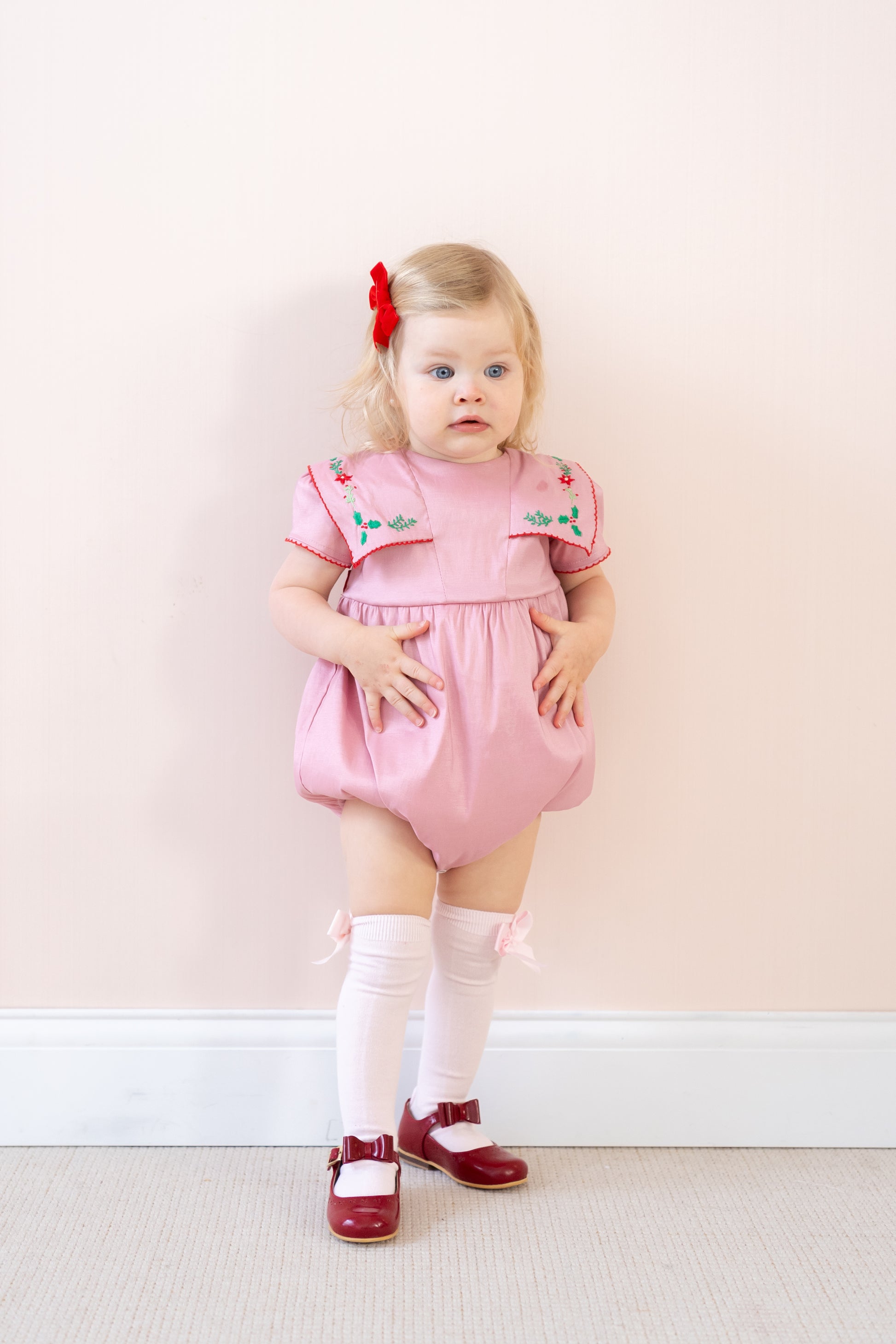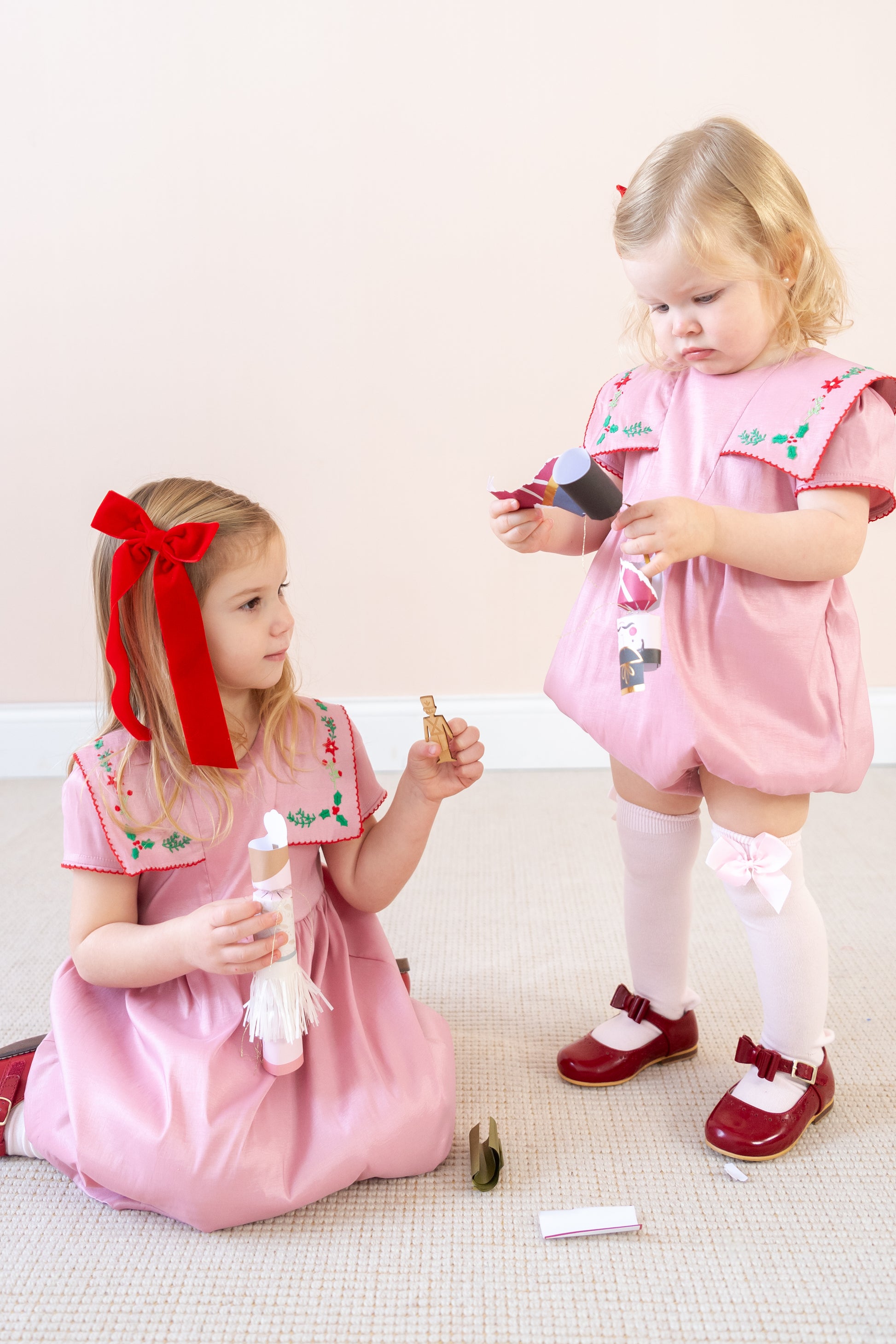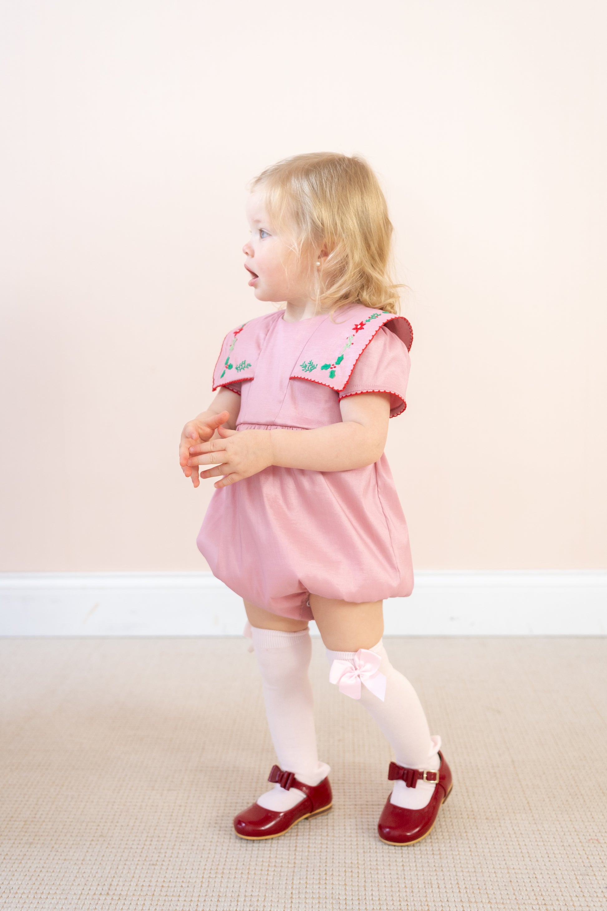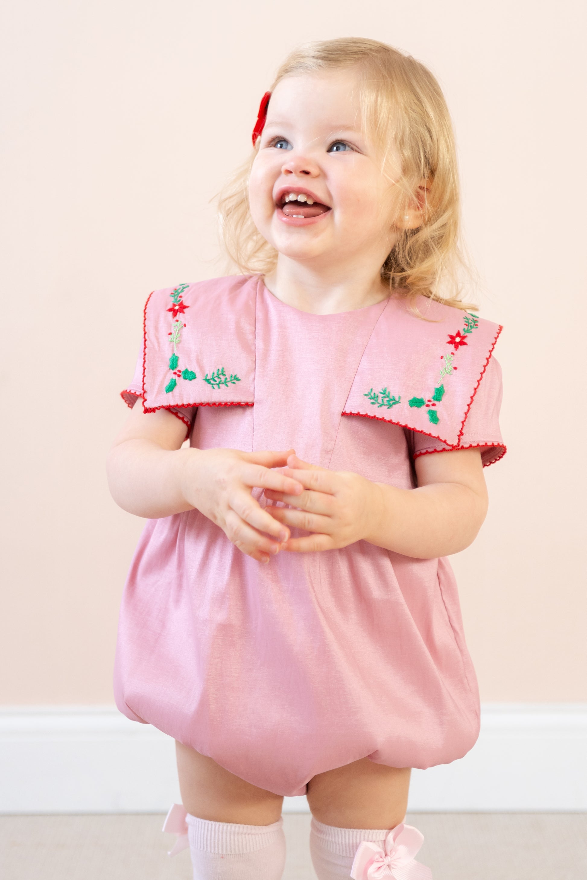 Dress her in timeless holiday charm with this embroidered bubble. Featuring a unique square collar with hand-stitched holly and poinsettia embroidery, scalloped red trim, and delicate puff sleeves, this bubble is full of festive elegance. The sheen pink fabric makes it a standout holiday piece while still being comfortable for your little one to wear all day. There is a matching dress available for big sister!