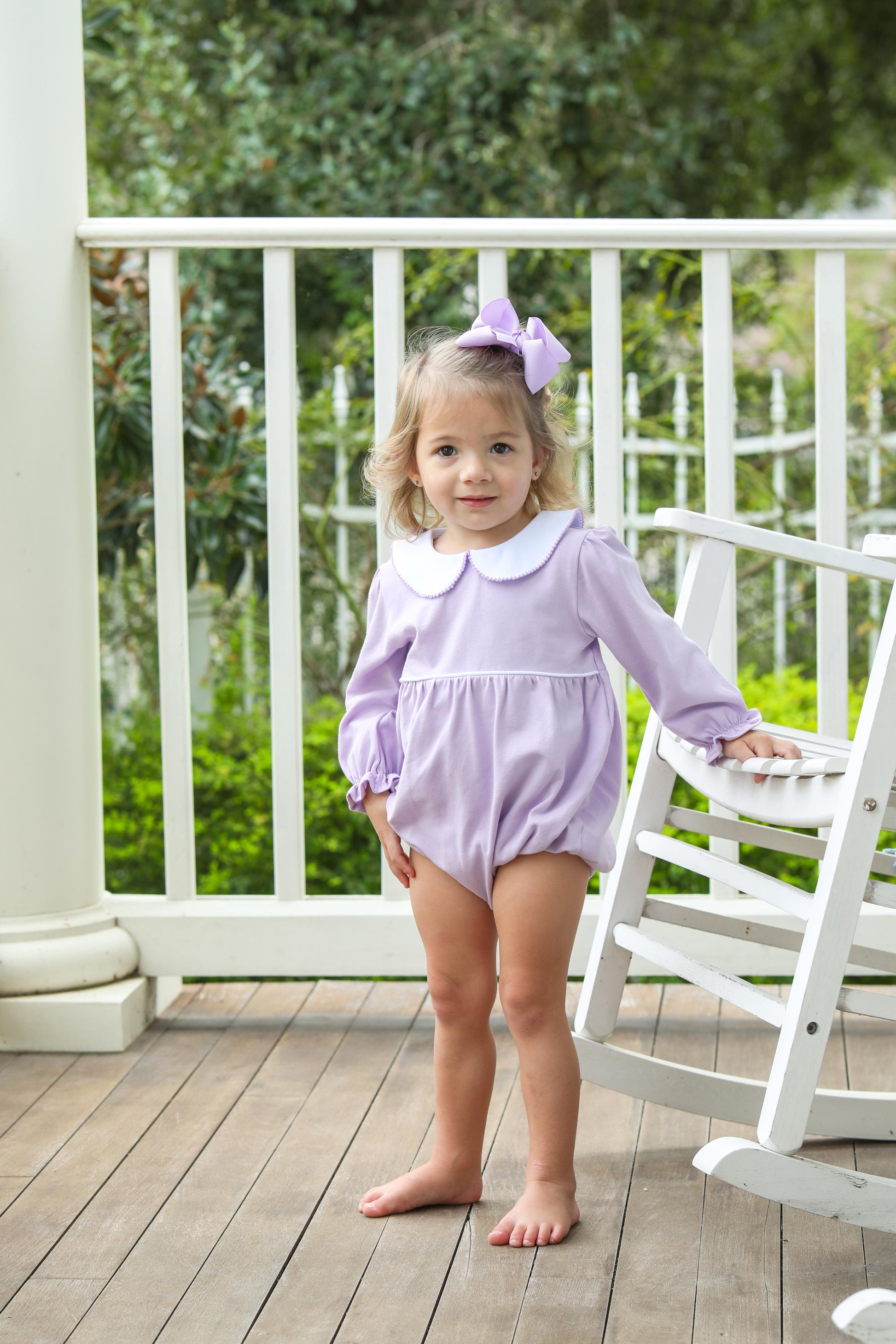 The Claire Bubble in Lavender is a darling staple for your little one’s wardrobe. Made from a soft, stretchy cotton blend, this bubble features a sweet empire waist and long sleeves with gentle ruffle cuffs. The crisp white Peter Pan collar is finished with delicate lavender picot trim for a classic touch. Snap closures at the bottom make diaper changes a breeze.