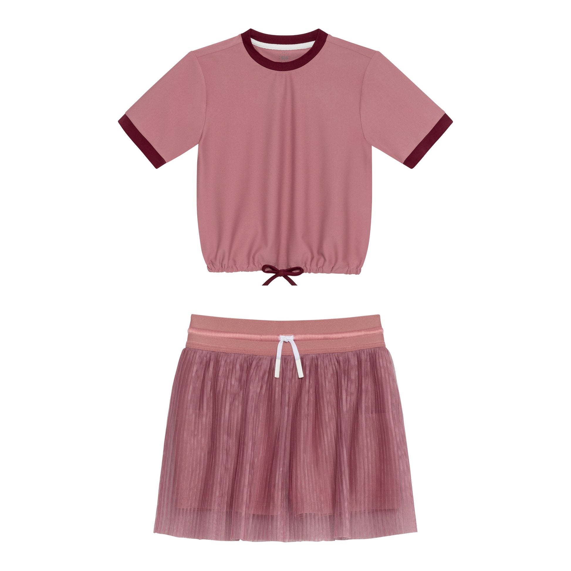 Calling all the fun girls! This set features an athletic feel dusty, pink cropped shirt with maroon detailing, paired with a sheer, pleated skirt with built-in shorts underneath. This set will take your active girl wherever she wants to go!