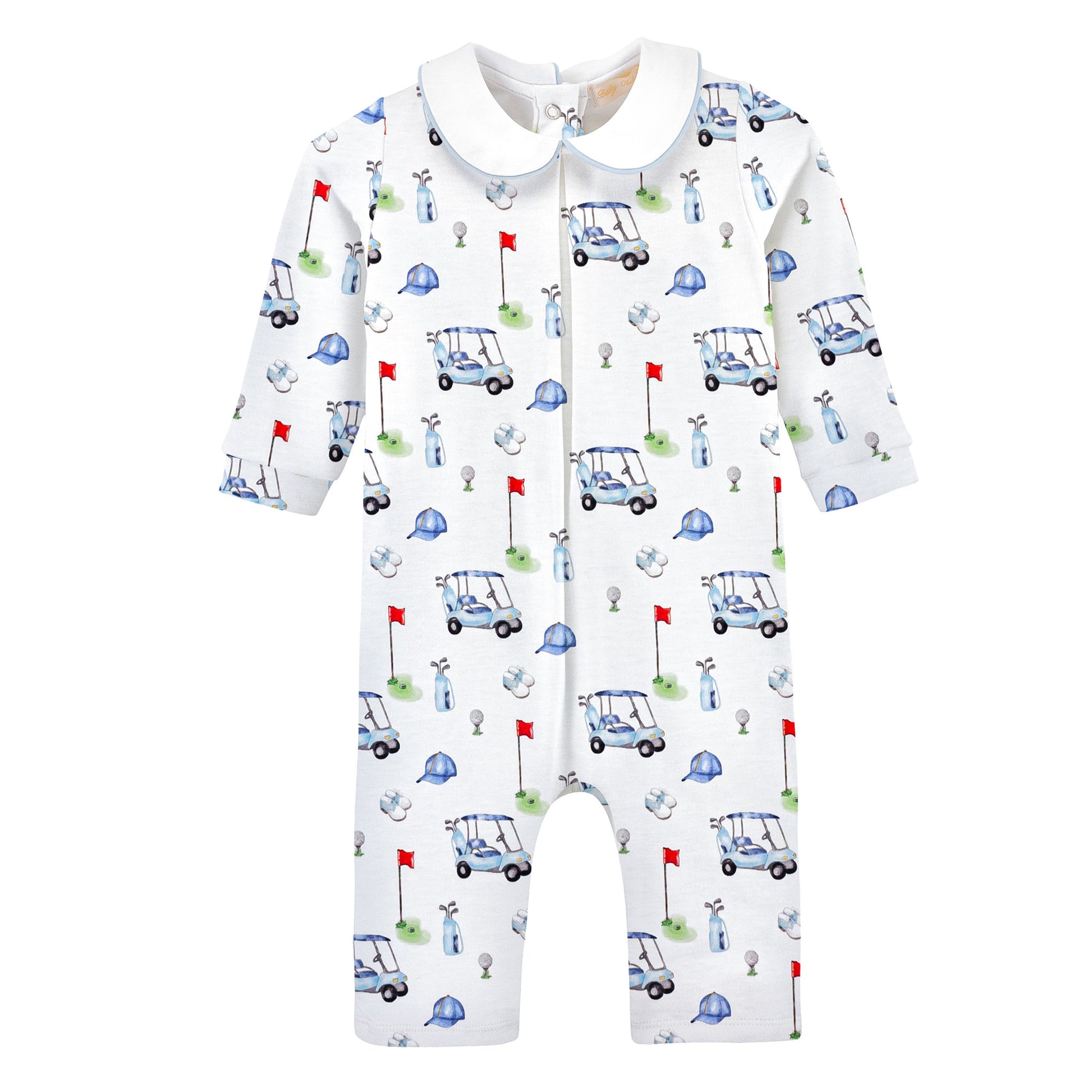 Ready for a day on the green! This adorable golf-print romper features a classic collar and leg button closures for quick changes. Soft, comfy, and perfect for your little golfer-in-training! Big brother can match in the same soft, printed T-shirt!