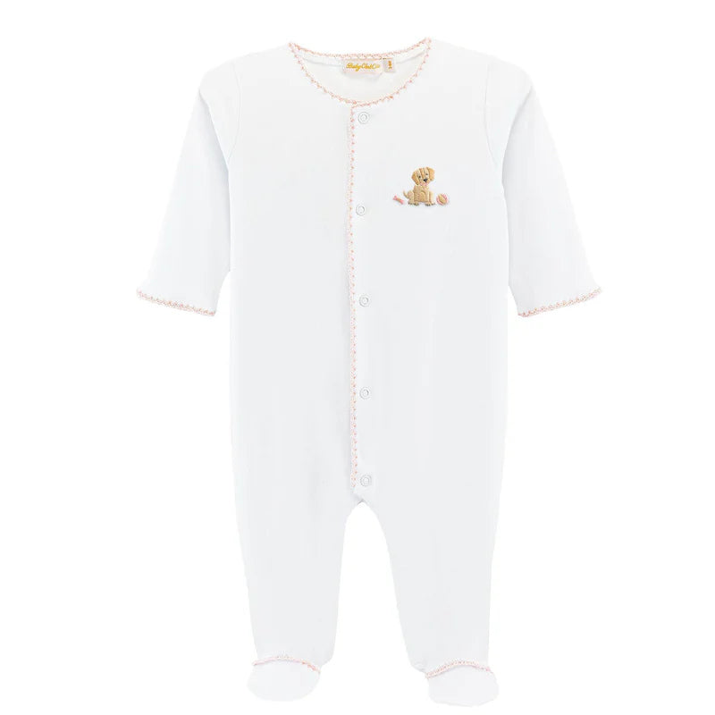 Sweet and snuggly for your little pup lover! This soft white footie features pink trim and the cutest embroidered puppy detail. Comfy, cozy, and perfect for everyday cuddles. Made from 100% Pima cotton. Pair with the matching good puppy bib for the perfect gift set.