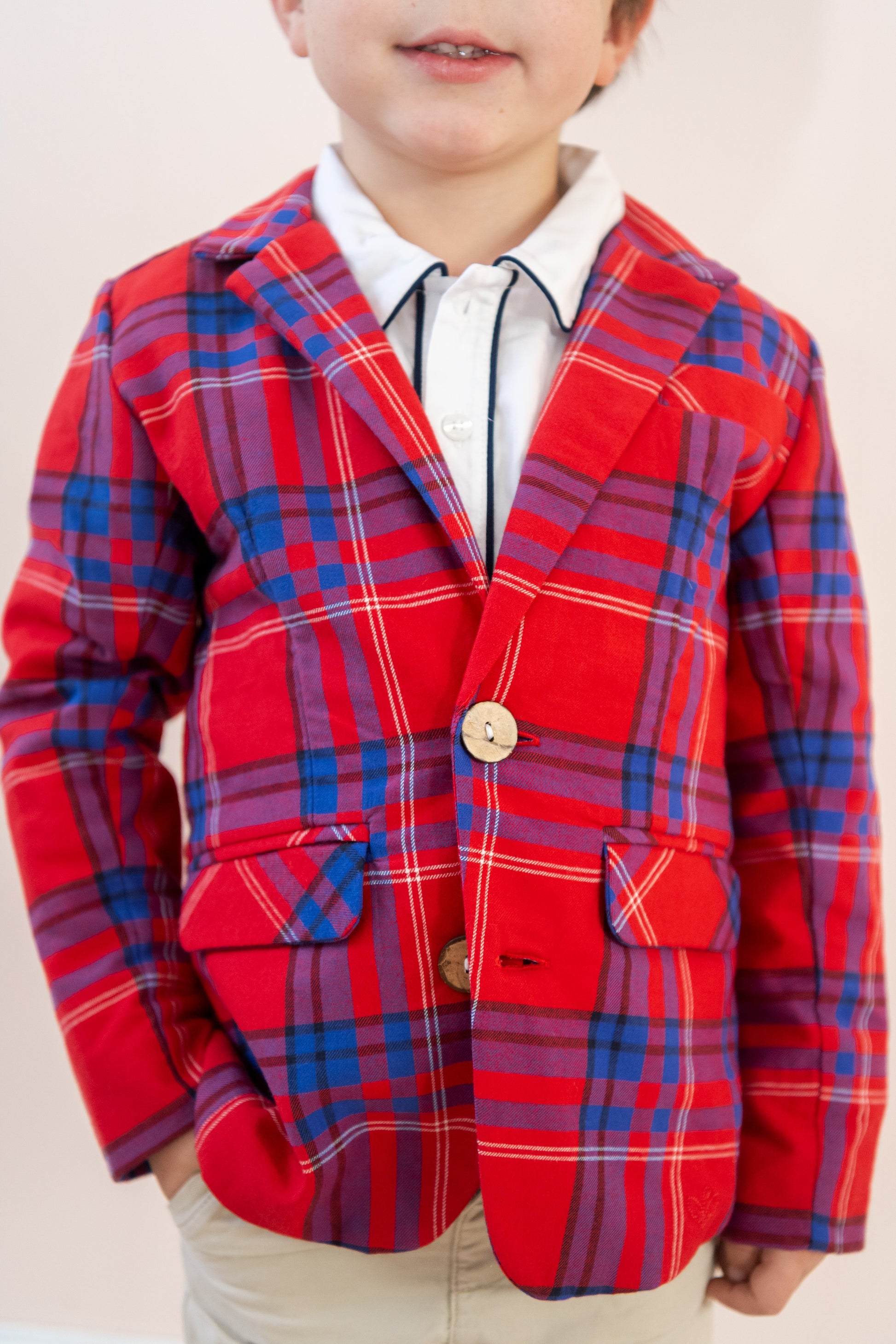 Make holiday dressing extra special for your little boy with this red plaid blazer from Dondolo. Designed with a classic tailored fit, wooden button closures, and front flap pockets, this blazer adds a timeless touch to festive celebrations. The bold red and blue plaid pattern makes it perfect for Christmas parties, family portraits, or any special occasion where your little one needs to look sharp. Grab the same plaid print in other styles for sibling matches!