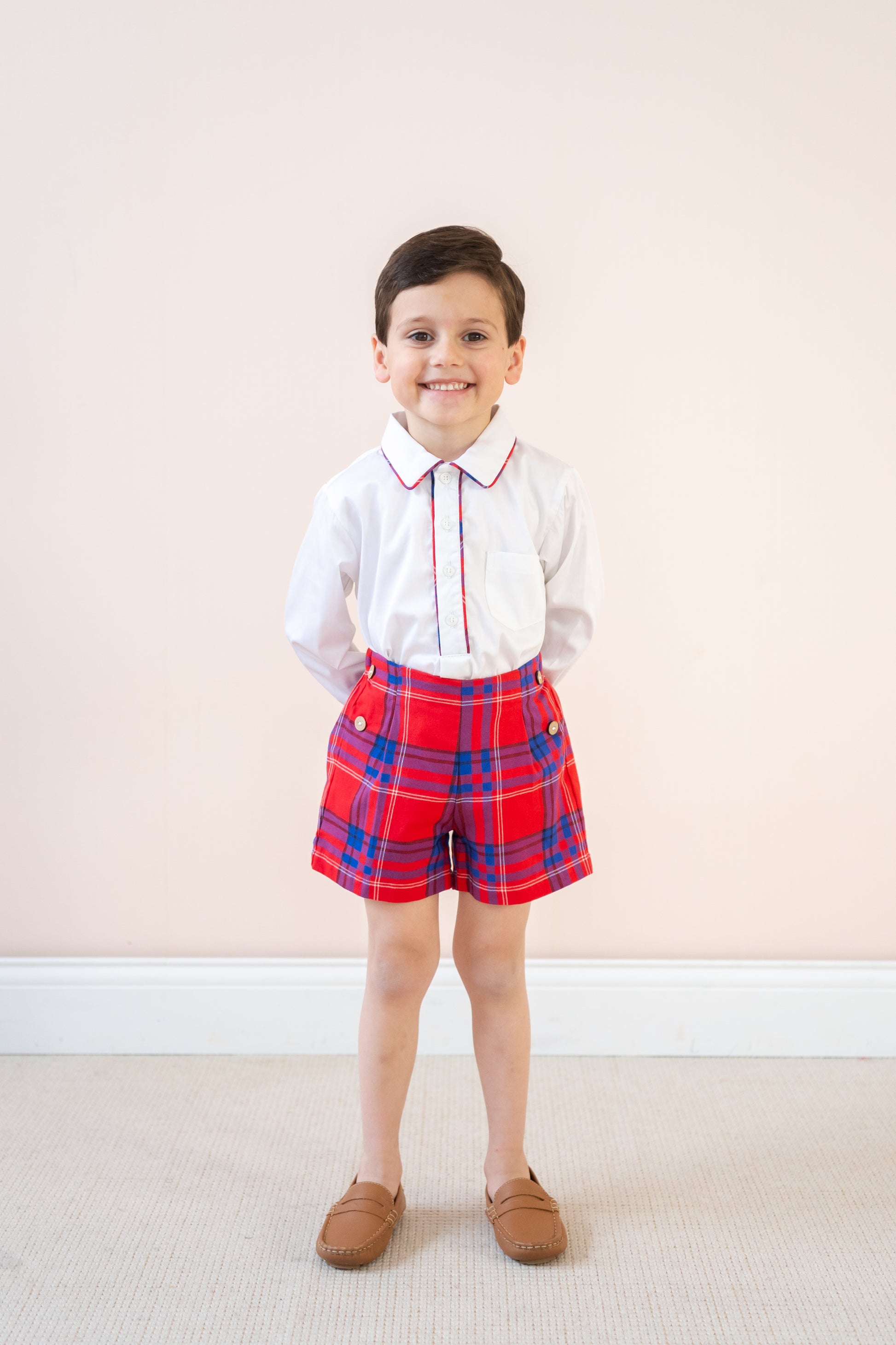Classic and timeless! This red plaid short set for boys is the perfect outfit for holiday gatherings, family portraits, or festive celebrations. Featuring a crisp white long-sleeve shirt with red piping details and coordinating plaid shorts, this set is both traditional and comfortable.