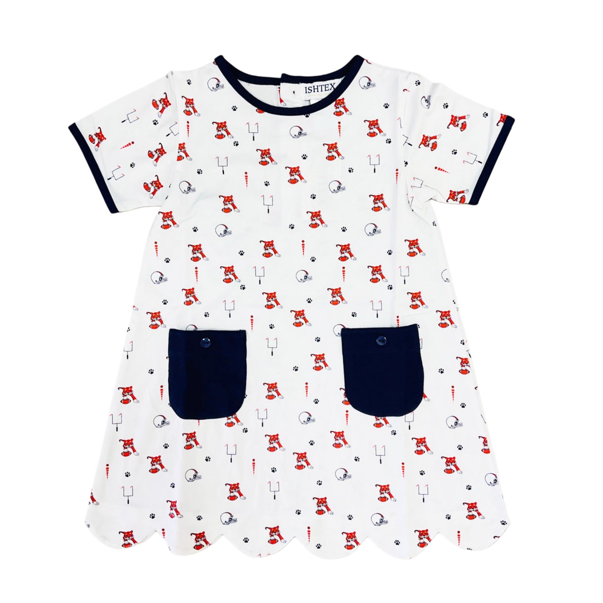 Cheer on the Tigers in style! This knit dress features an allover Auburn tiger and football print, scalloped hem, and navy trim. Finished with front pockets for an extra sweet touch—perfect for gameday or everyday wear.