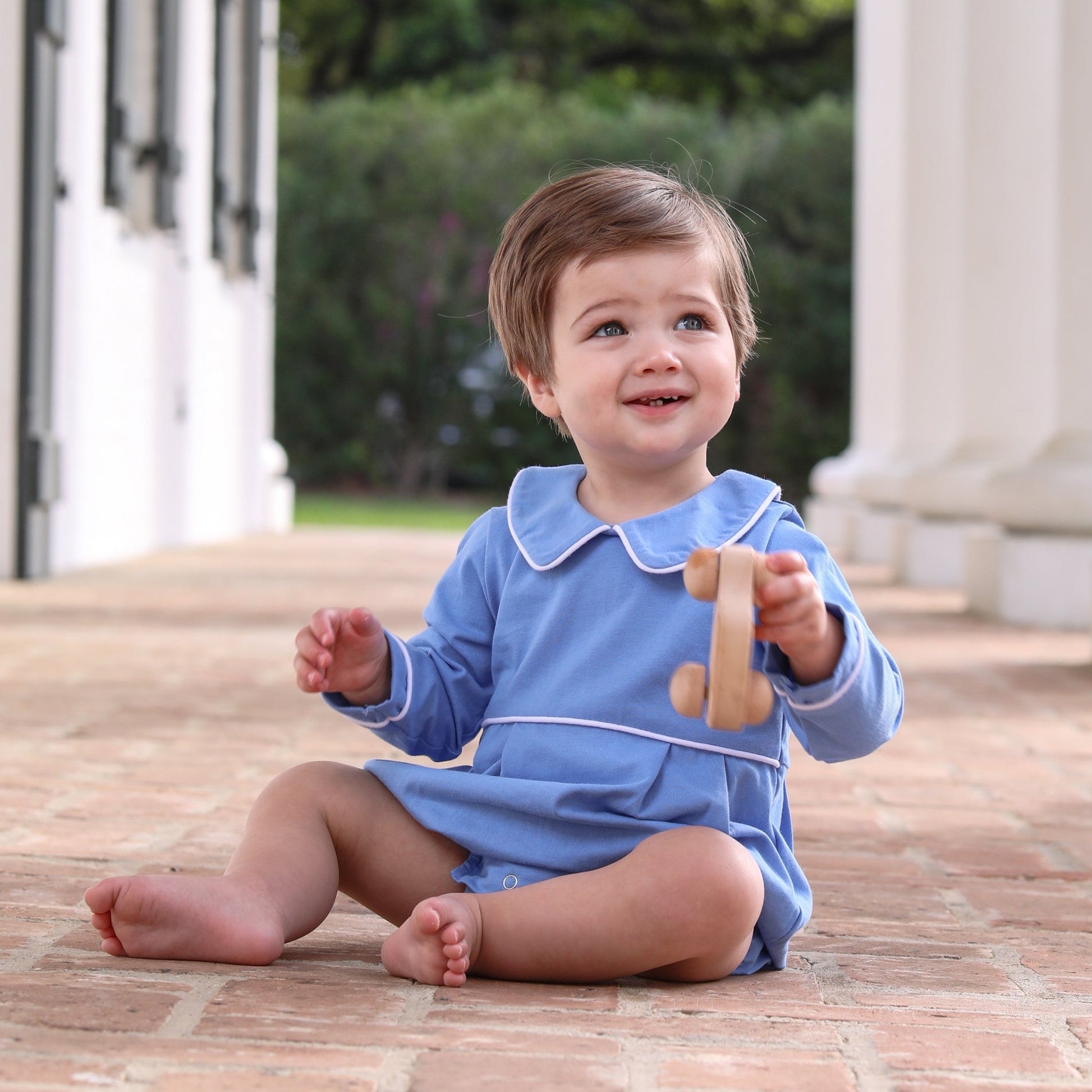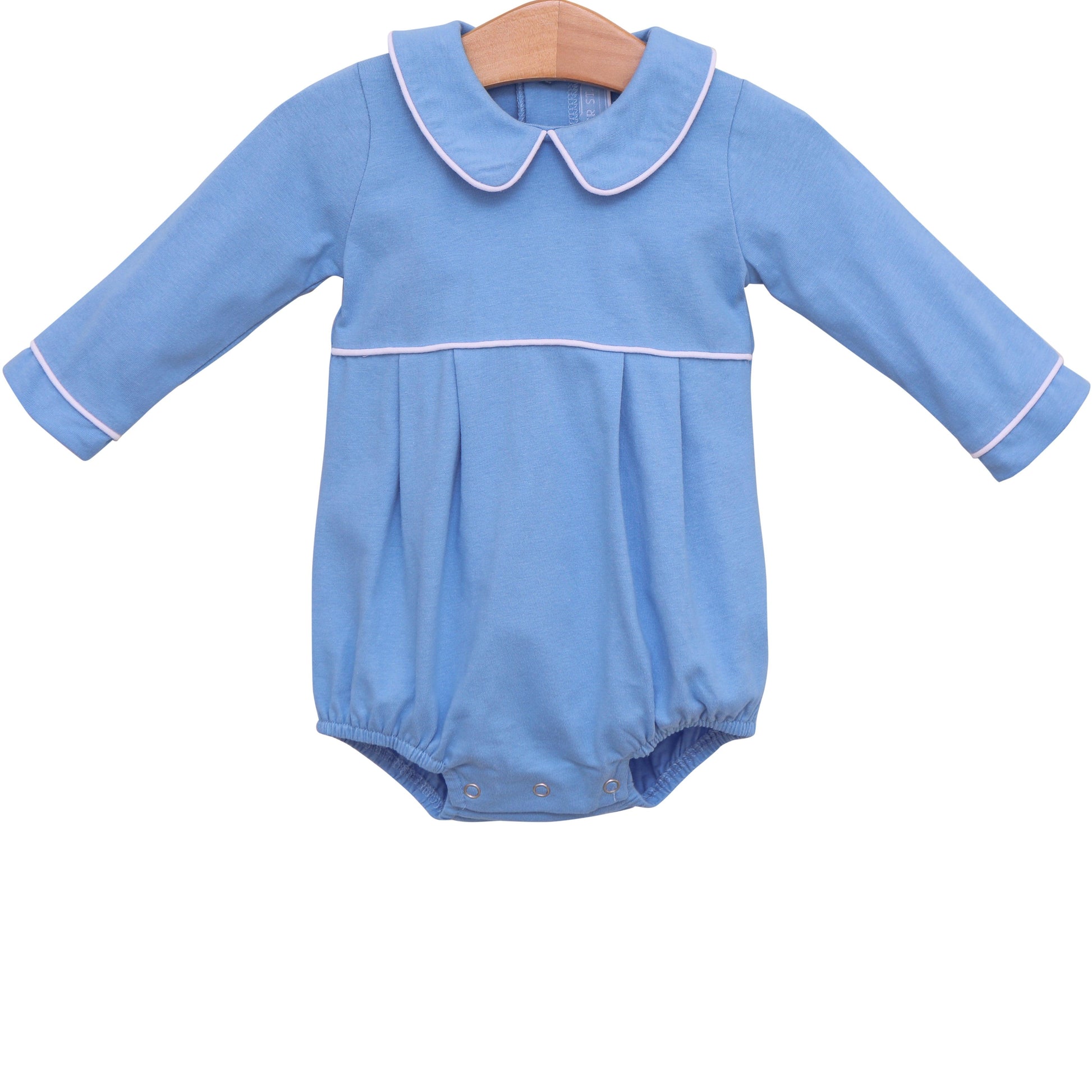 Sweet and classic, the Joseph Bubble in Cornflower is a darling outfit for baby boys. Featuring a soft cornflower blue knit body with contrasting white piping, this long-sleeve bubble includes a traditional Peter Pan collar, gentle pleating, and cuff detailing for a timeless look. The elastic leg openings ensure a comfortable fit, while the snap closures at the back and bottom make changes easy and fuss-free.