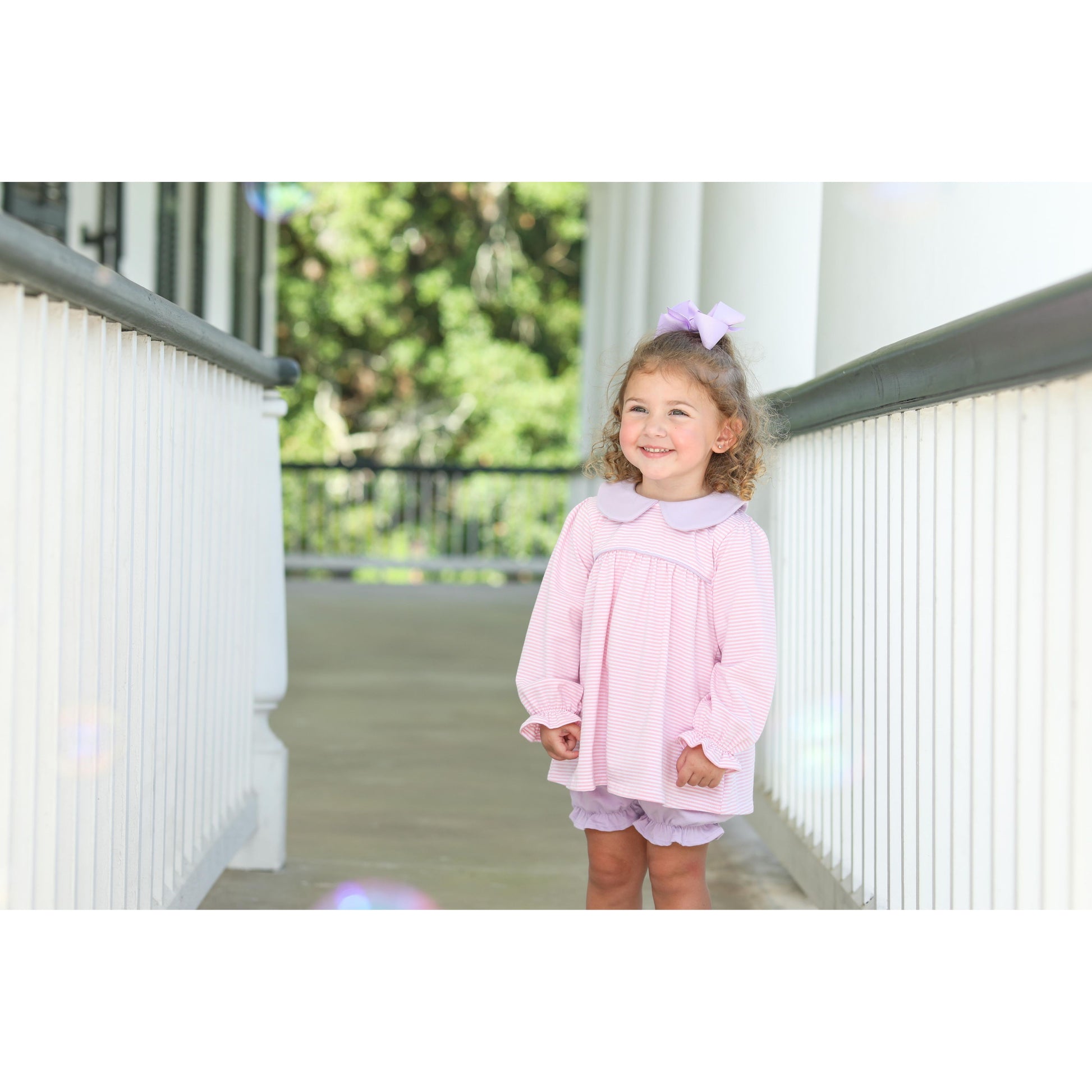 Sweet and timeless, the Katherine Bloomer Set in Light Pink Stripe & Lavender is a precious pick for your little girl. The top features soft light pink and white stripes, a contrasting lavender Peter Pan collar, and delicate piping across the chest. Paired with matching lavender ruffle bloomers, this outfit is designed for style and comfort — perfect for special occasions or everyday charm.