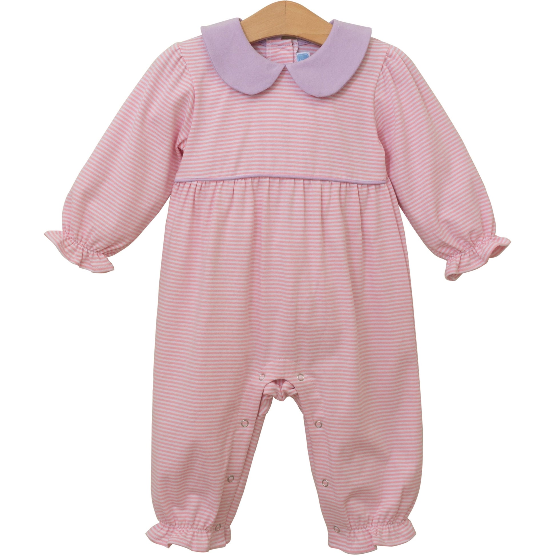 Delicate and darling, the Katherine Romper in Light Pink Stripe & Lavender is full of timeless charm for your little one. Featuring soft pink and white stripes, this one-piece romper is accented with a sweet lavender Peter Pan collar and piped detailing across the chest. Gentle gathers, ruffle cuffs, and snap closures along the legs add both style and convenience — perfect for all-day comfort and easy changes.