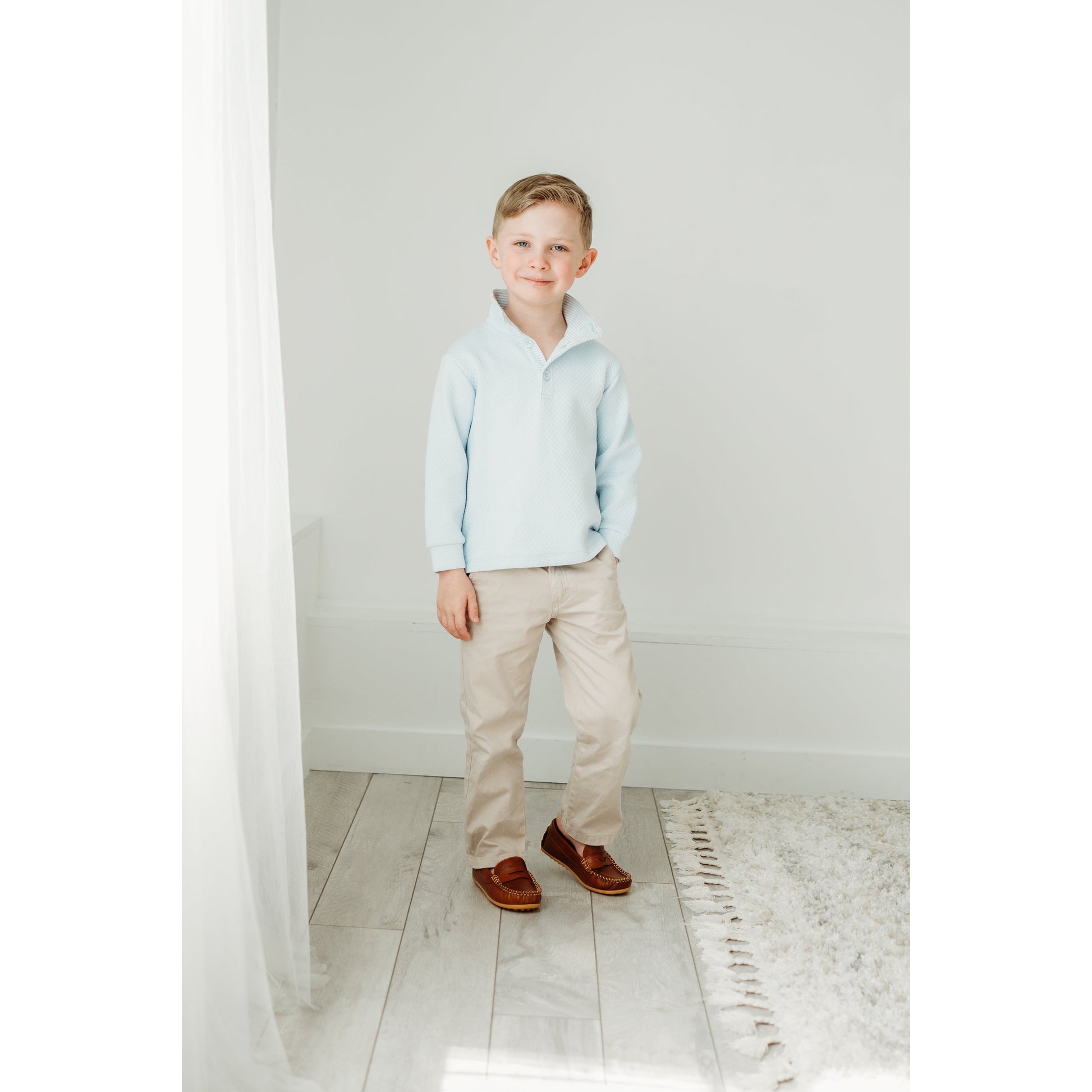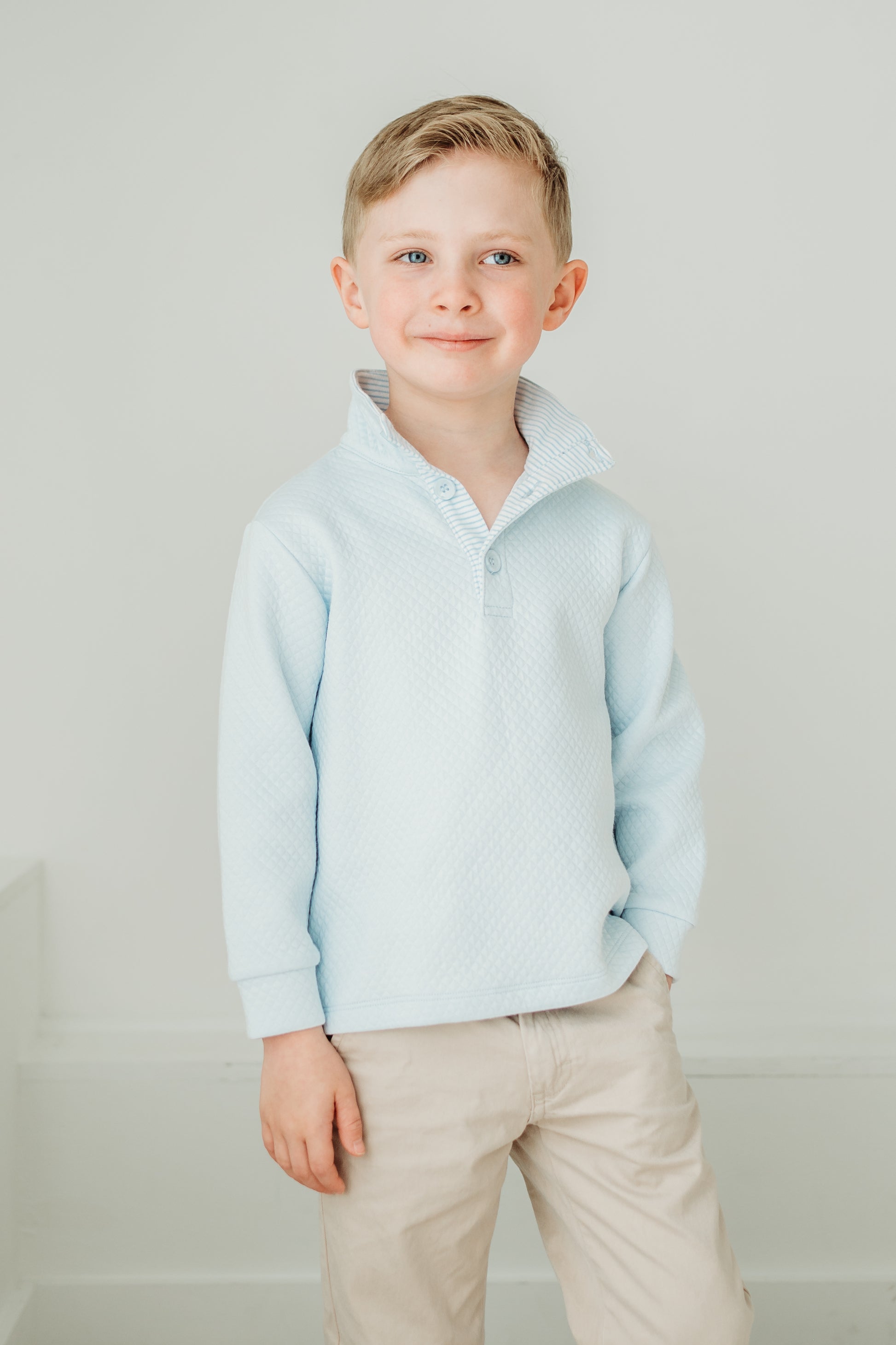 Classic and cozy, this quilted pullover is a versatile layering piece for cooler days. Designed in soft light blue with a subtle diamond texture, it features a snap neckline with striped lining for a polished look. Comfortable yet stylish, it’s perfect for school, play, or family outings.