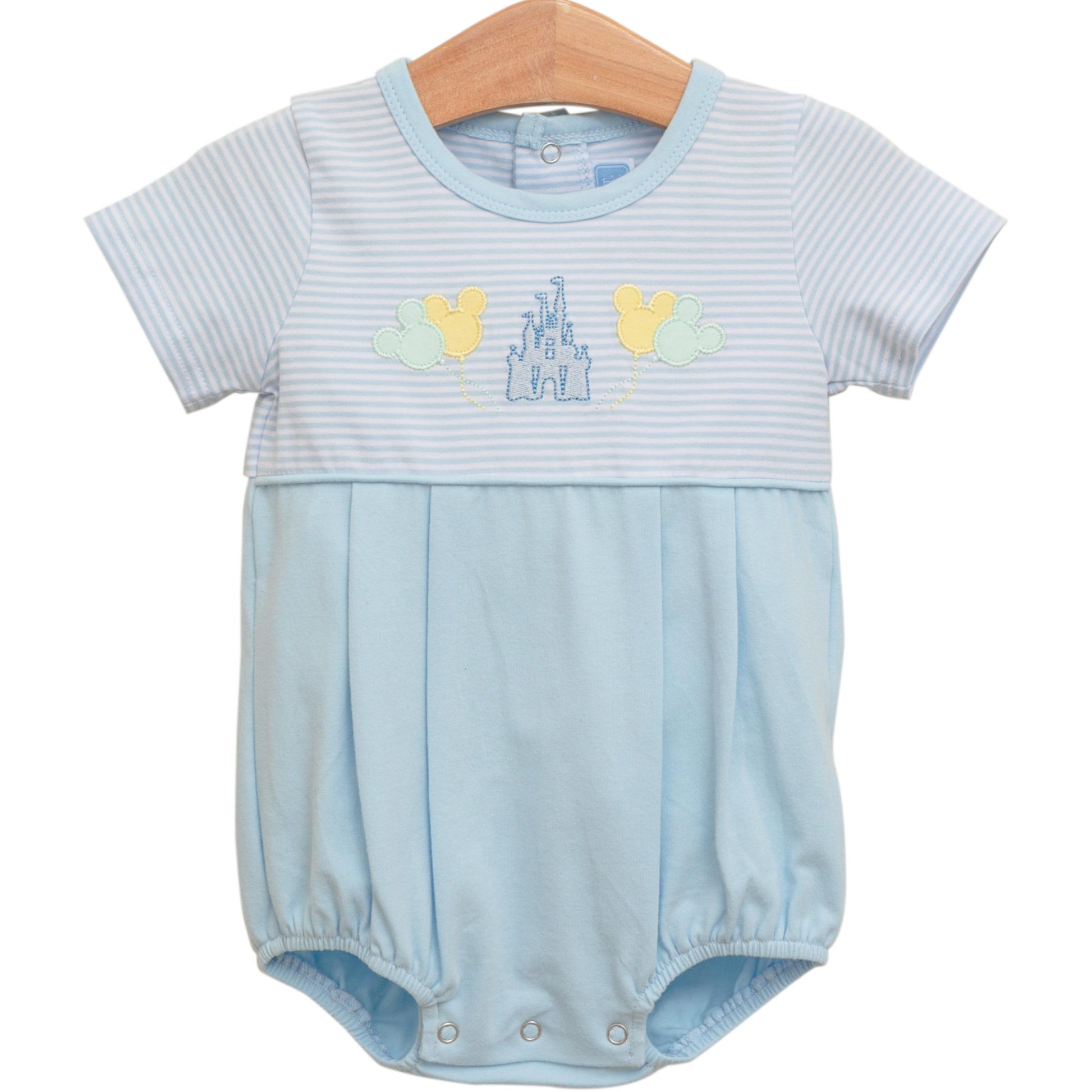 Bring a touch of magic to your little one’s wardrobe with this adorable light blue bubble! Featuring a striped top with castle and balloon embroidery, it’s a sweet choice for special outings, vacations to Disney, or everyday play. Soft cotton keeps baby comfy, while snaps at the bottom make dressing and diaper changes quick and easy.