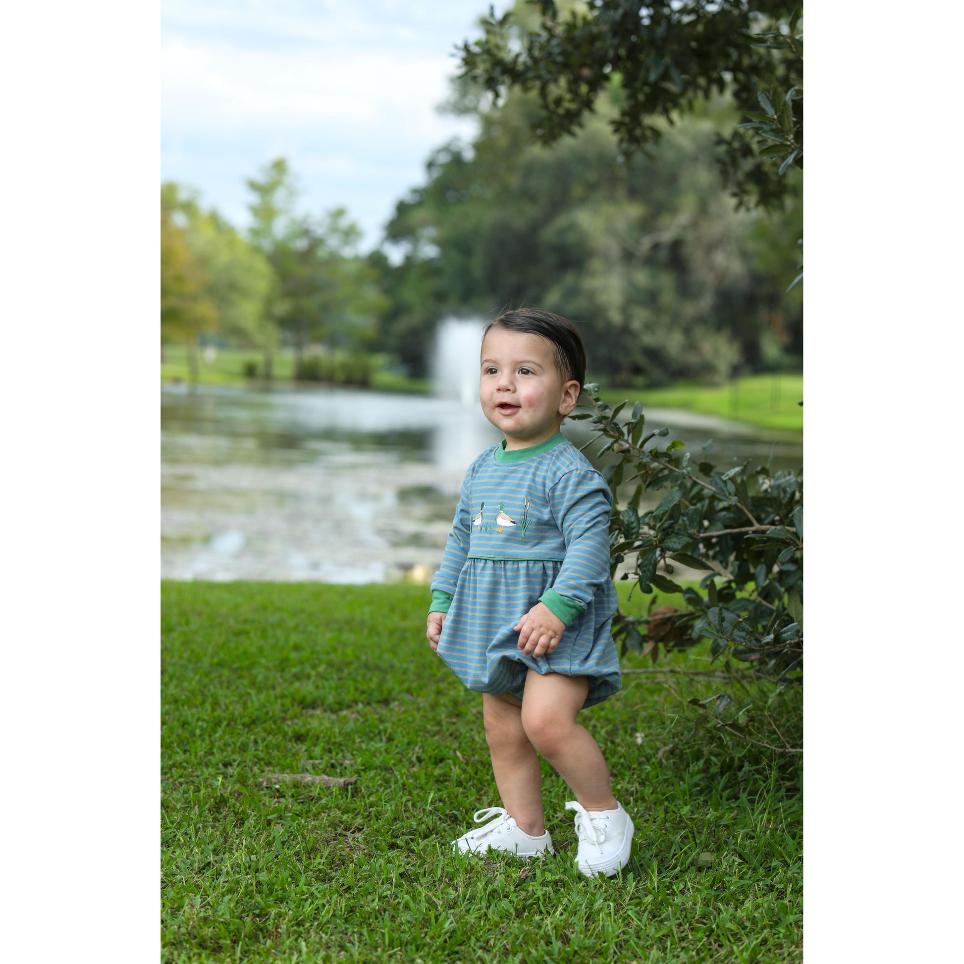 The Mallard Embroidery Bubble from Trotter Street Kids brings timeless Southern charm to your little one’s wardrobe. Featuring soft blue and olive stripes with embroidered mallard ducks and cattails, this long-sleeve bubble is perfect for fall outings and holiday gatherings. Designed with button closures for easy dressing and diaper changes, it’s both classic and practical.