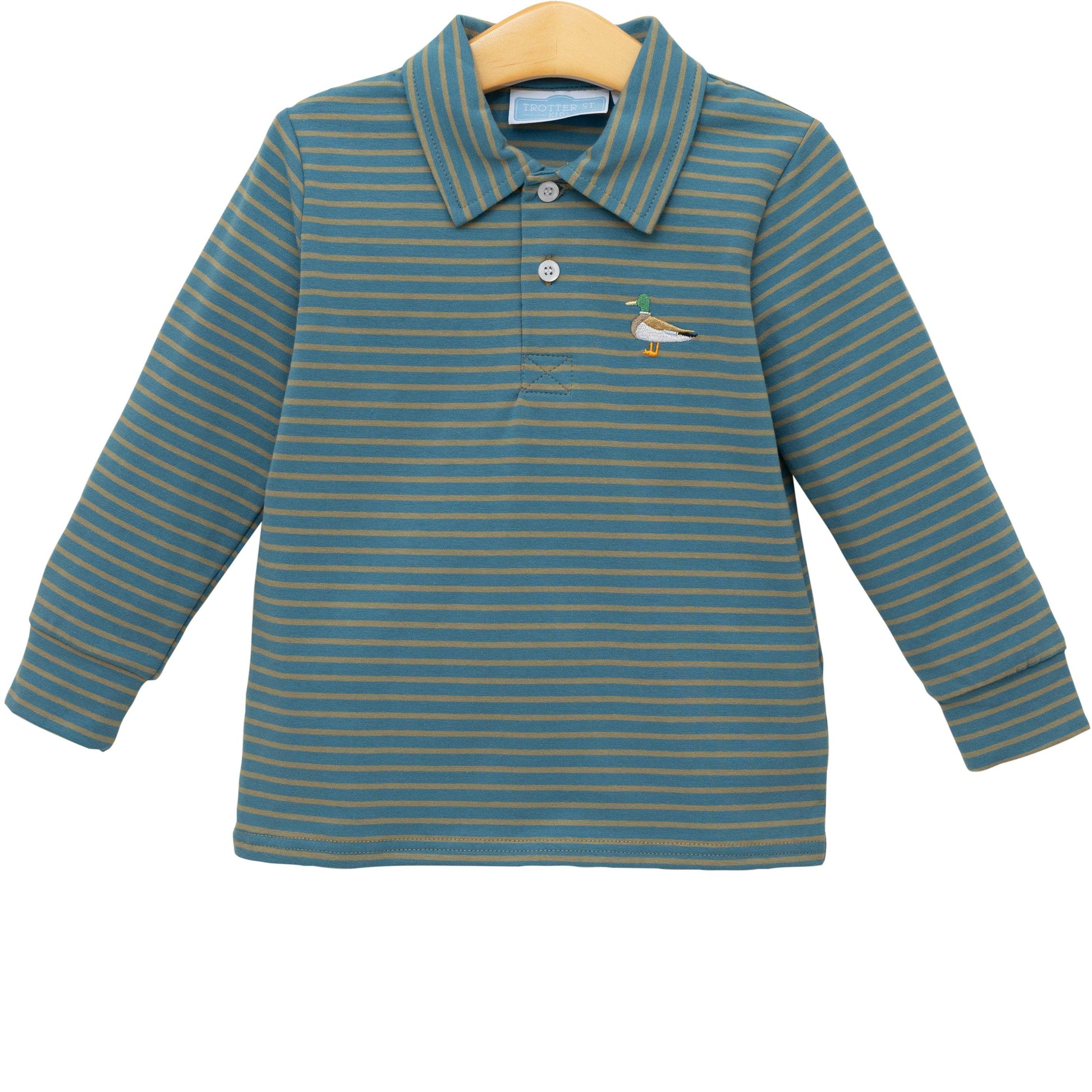 The Mallard Embroidery Polo by Trotter Street Kids is a timeless fall classic. Featuring soft blue and olive stripes with a collared neckline and mallard embroidery on the chest, this long-sleeve polo strikes the perfect balance of comfort and charm. Ideal for family outings or holiday gatherings, it’s a versatile piece that pairs effortlessly with pants or shorts.