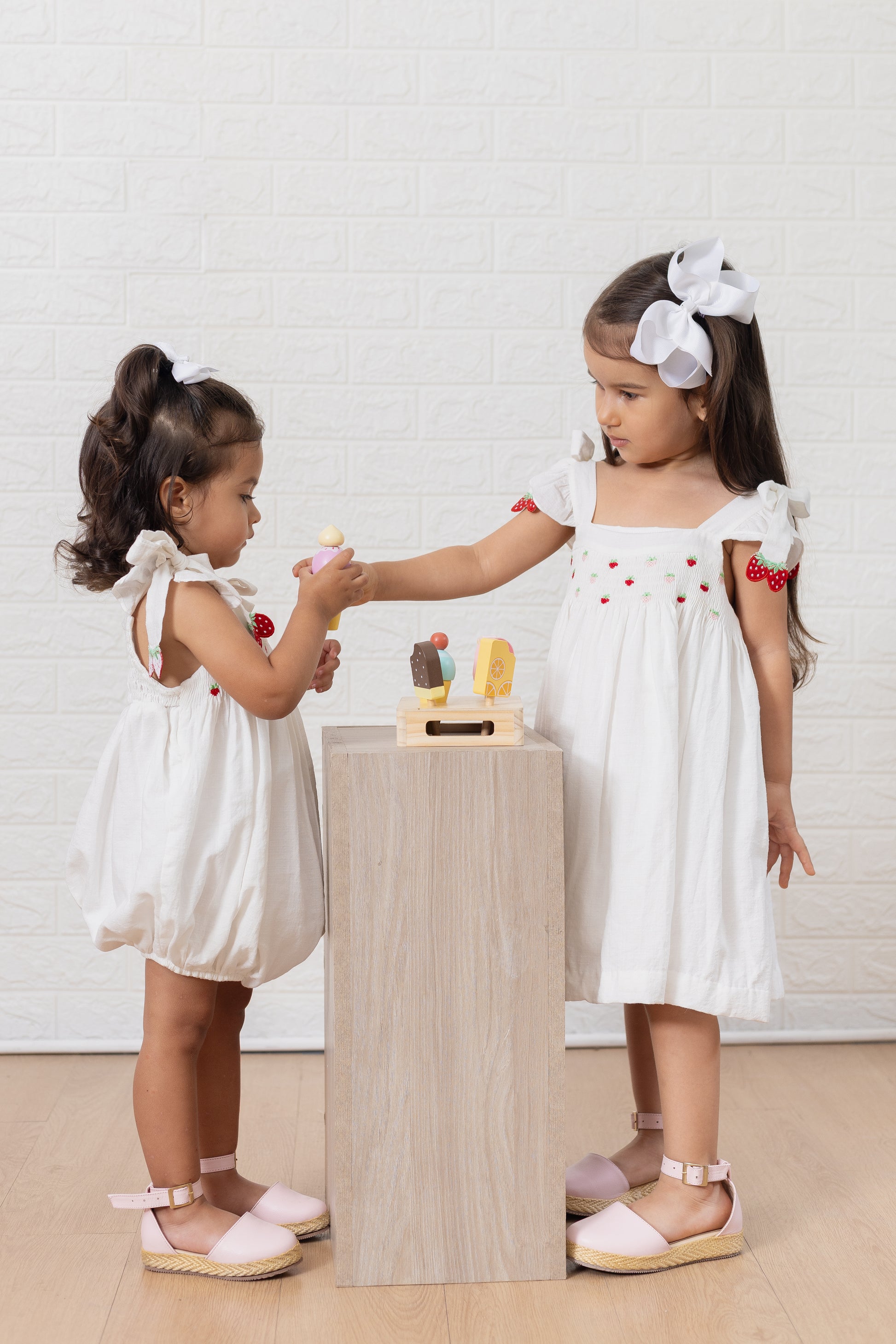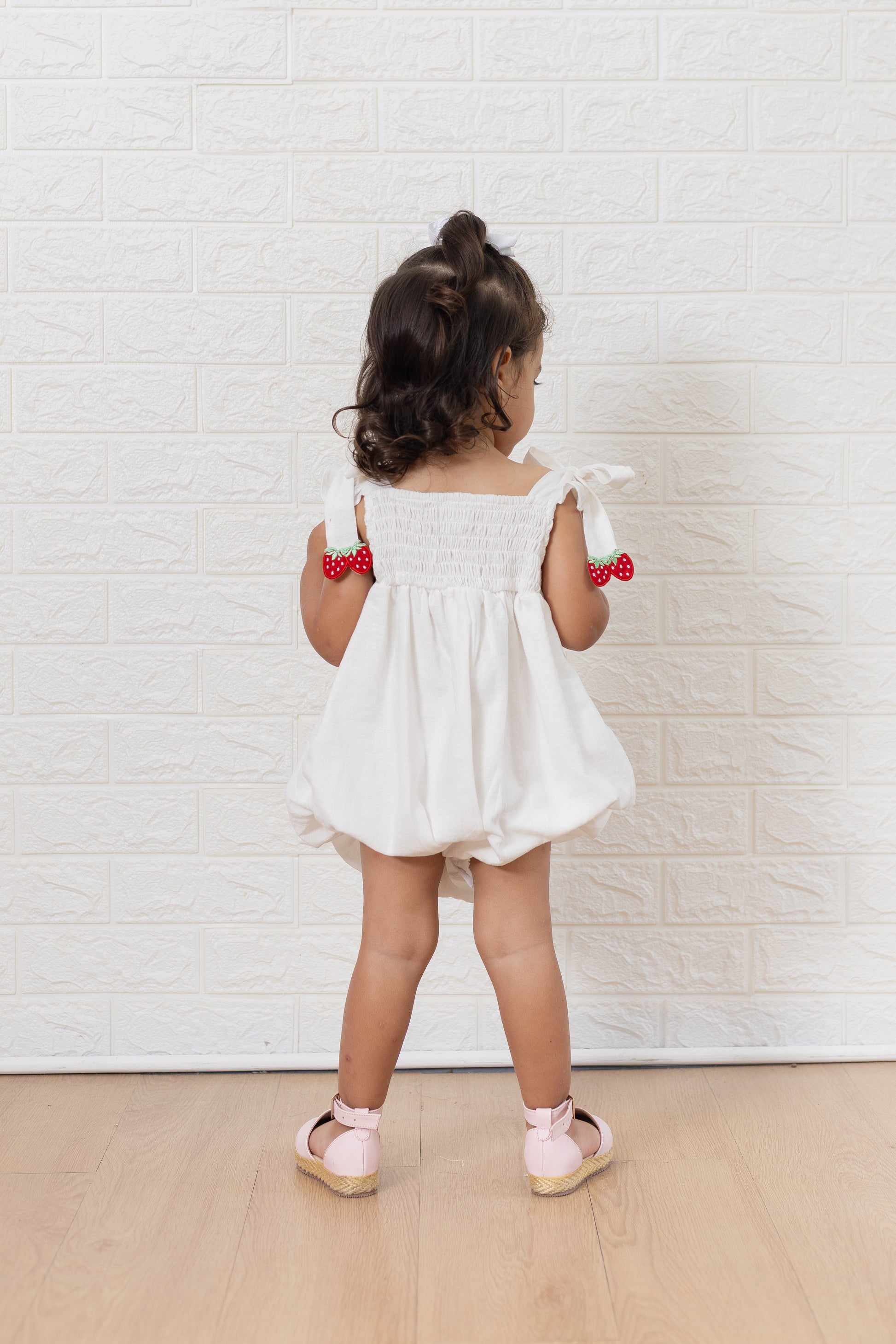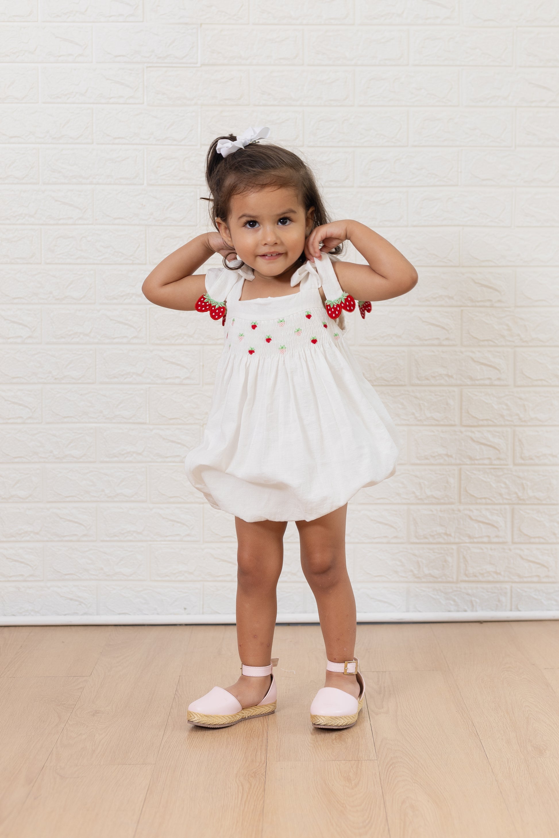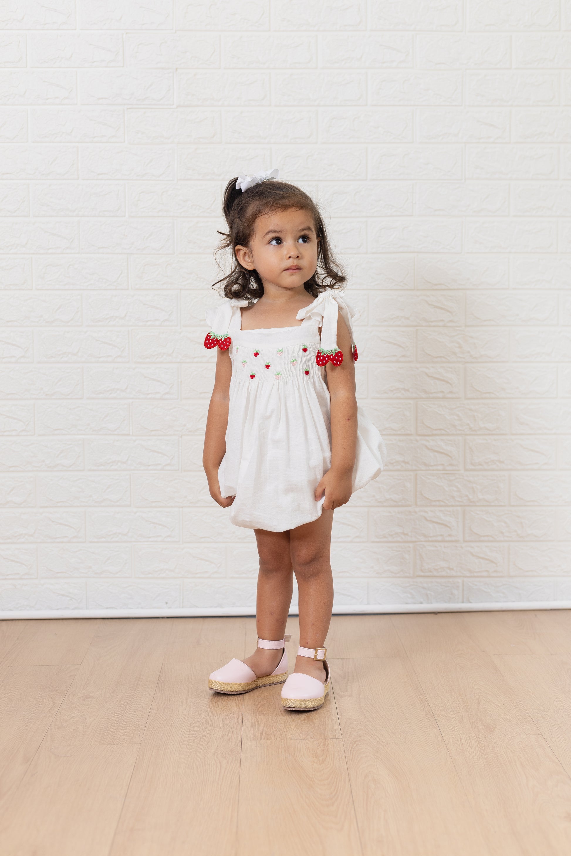 This precious girls bubble features delicate hand-embroidered strawberries and charming shoulder tie straps for a sweet, timeless look. Designed with lightweight, breathable fabric and a classic silhouette, it’s perfect for summer outings, special occasions, and warm-weather portraits.