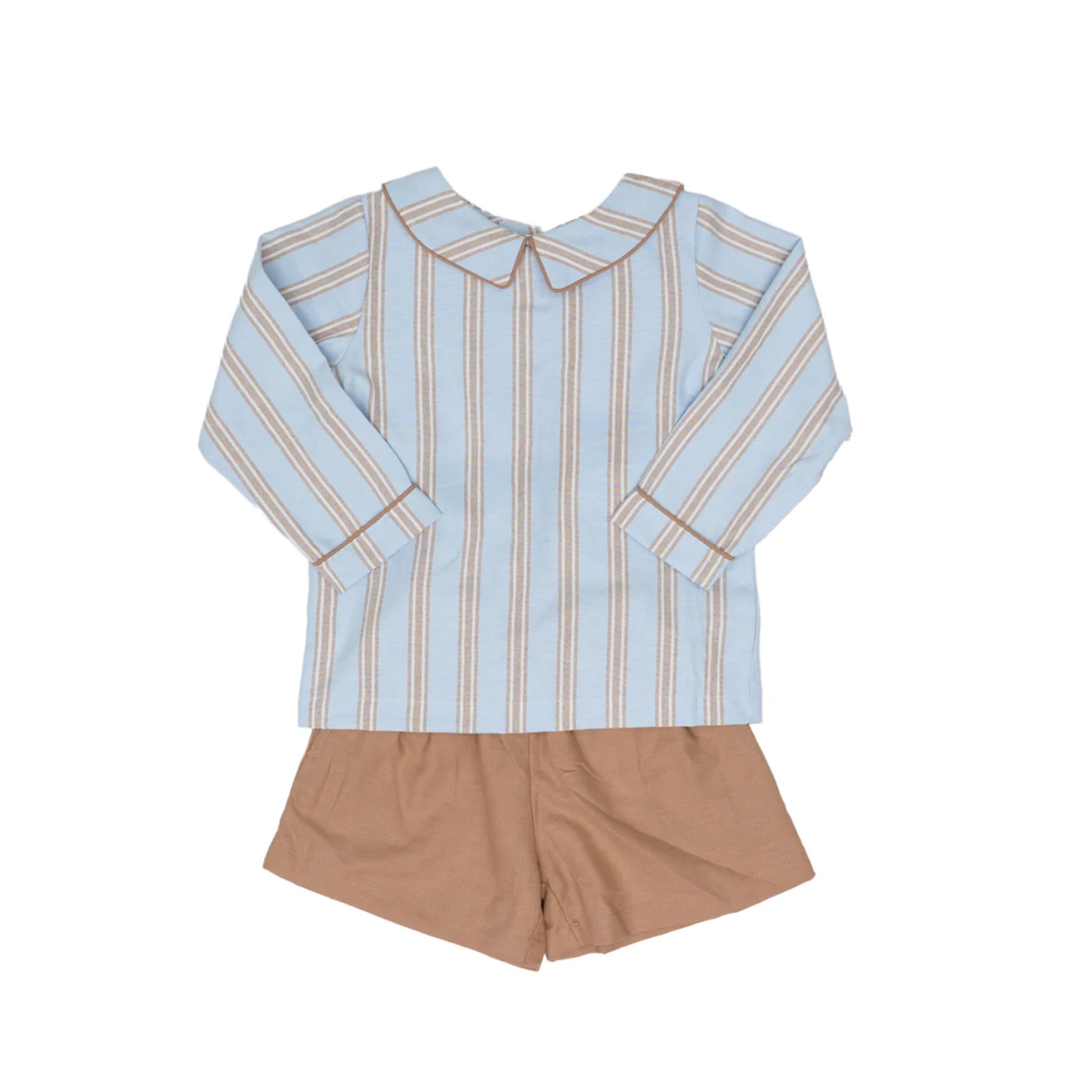 Get your little guy ready for the day in style with our Browning LS Blue and Brown Stripe Short Set! This set features a comfortable long sleeve shirt in a playful blue and brown stripe pattern, paired with brown shorts for a trendy yet comfortable look. With a classic collar, he'll look cool and confident all day long. Matches Mary Dress and William Shirt.