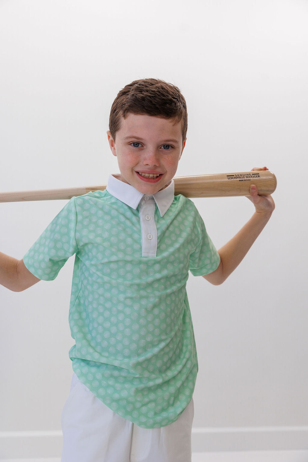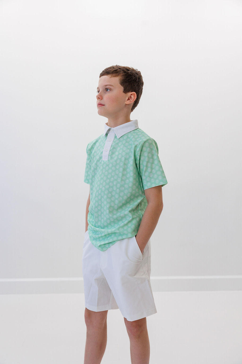 Courtside Kids clothing is one of a kind. This classic polo will take your kids to school, sports and everything in between. Featuring a white palm leaf print on a light green polo with a white collar.