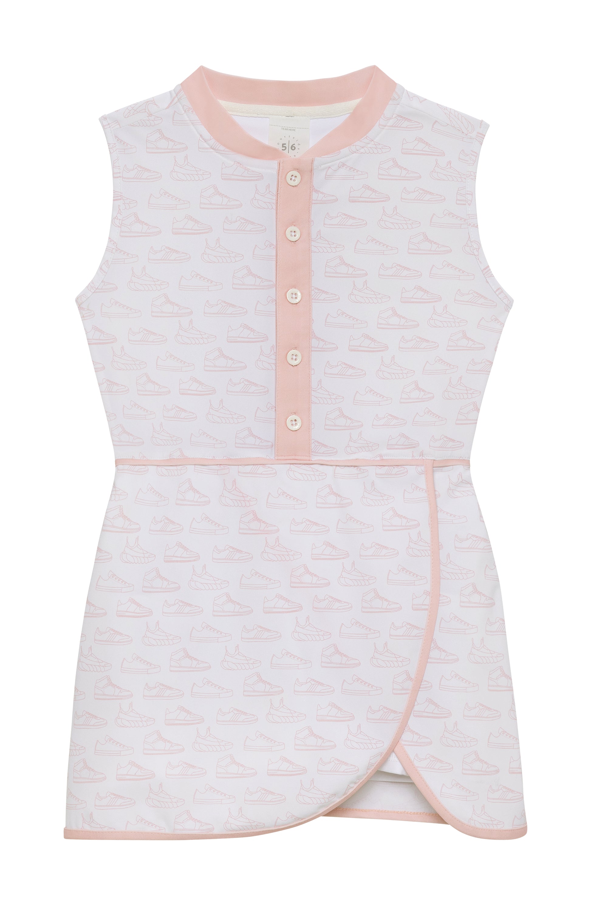 Courtside Kids clothing is one of a kind. It is wrinkle and stain resistant. This fun, sneaker print dress is made entirely out of performance fabric. Front buttons for easy on/off. It has built-in shorts, which makes it functional for your active girly.