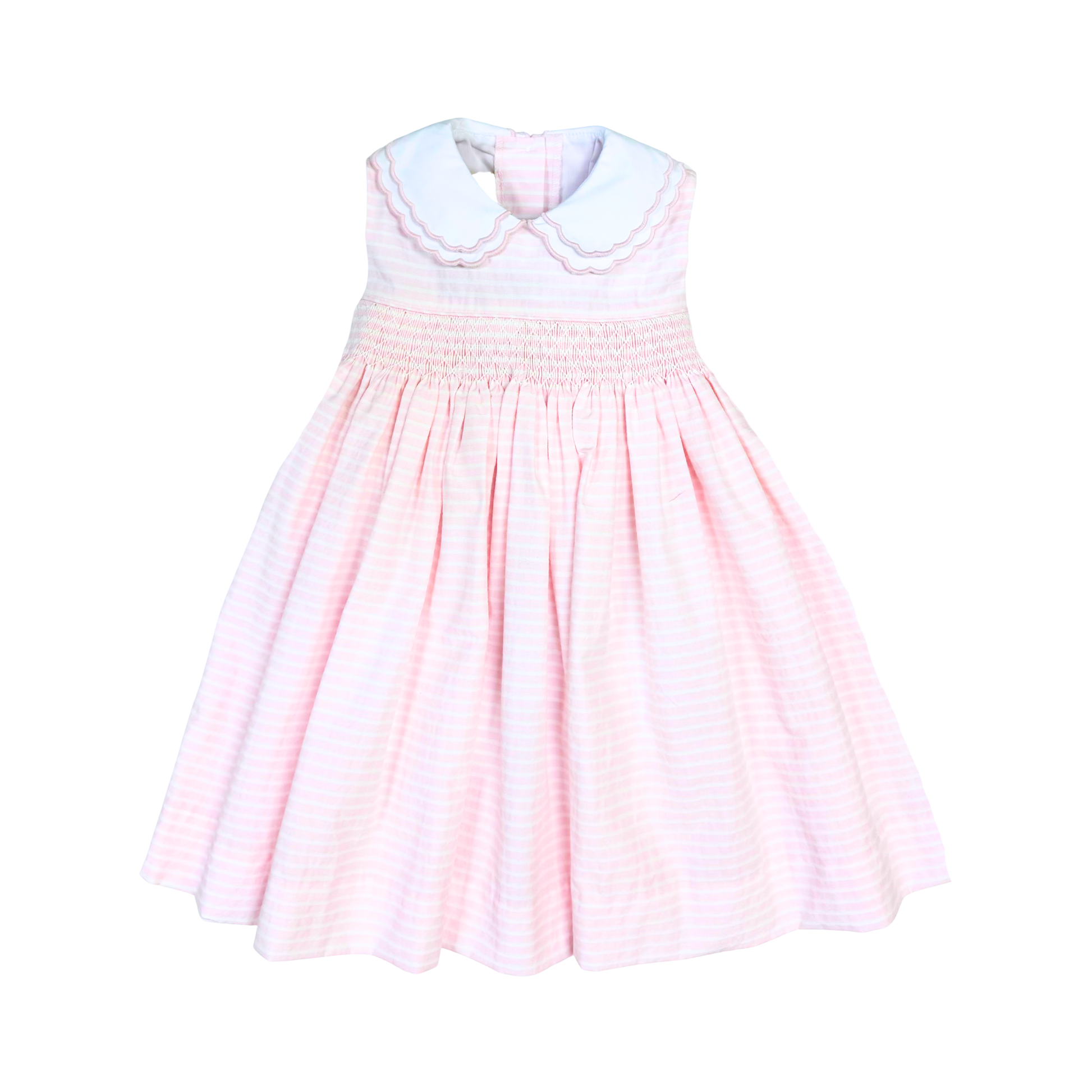 Classic pink pinstripe dress featuring a hand-smocked waist and a scalloped double layered Peter Pan collar for a timeless look. Designed with an extra-lined, full gathered skirt for a beautiful fit. Perfect for special occasions, portraits, and summer Sundays.