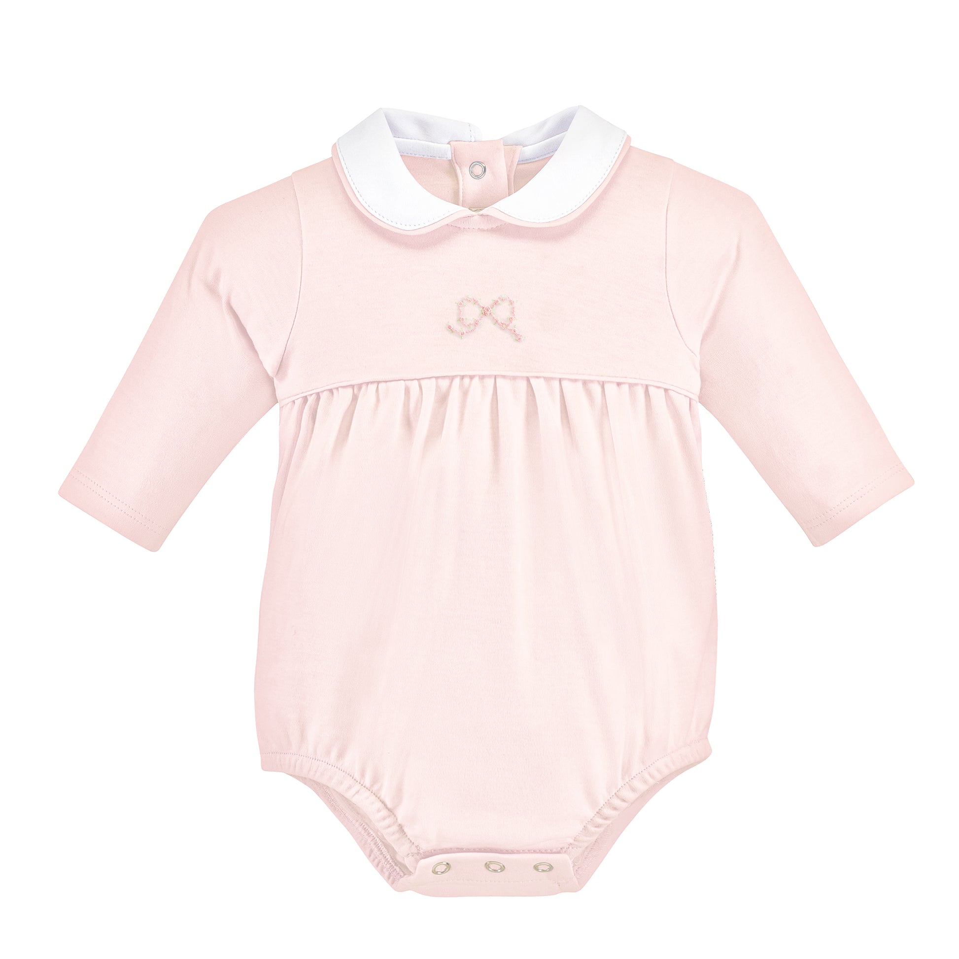 This soft, 100% Pima cotton baby girl long sleeve bubble features a simple, embroidered bow and a white Peter-pan collar. An adorable bubble that's perfect for any occasion.