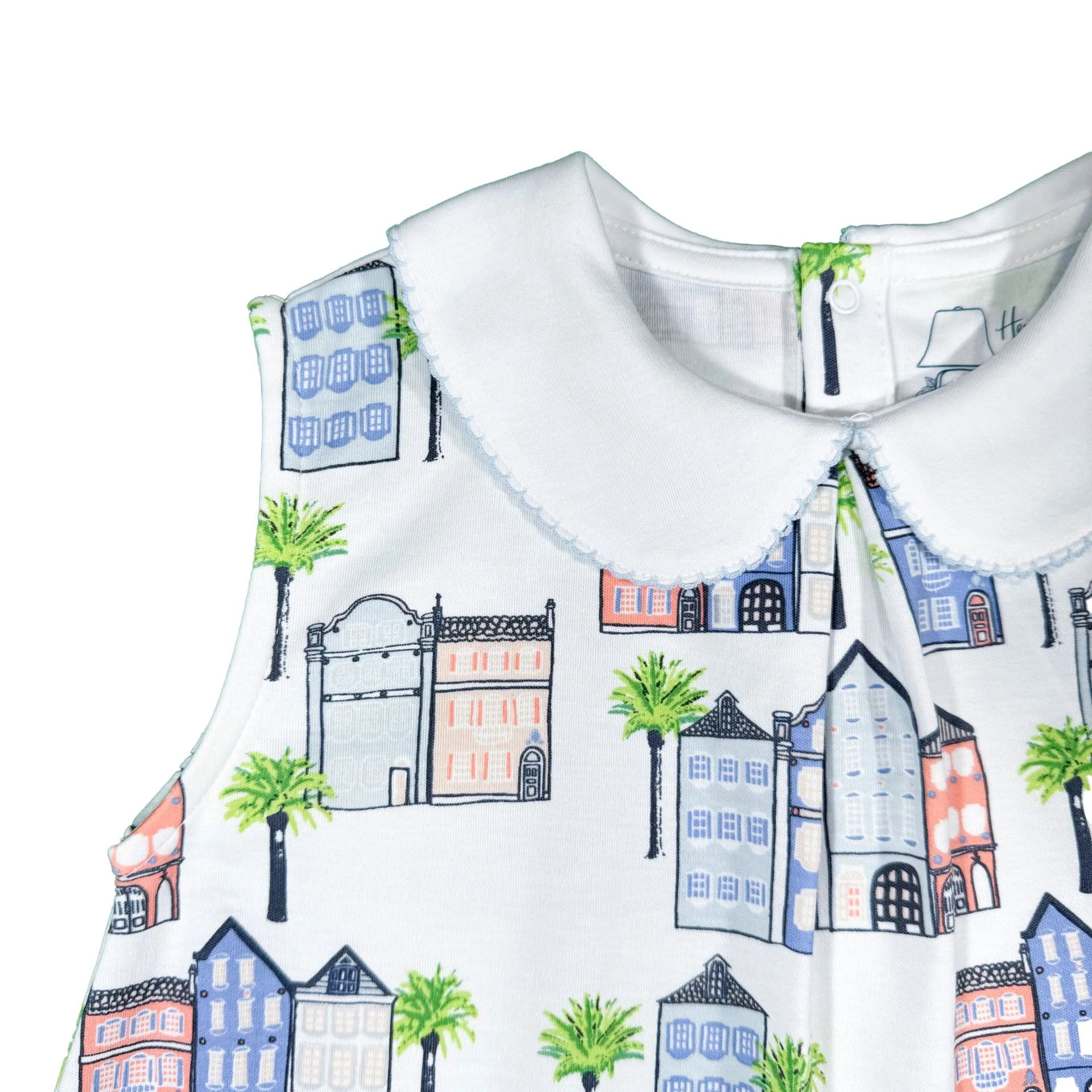 Lightweight dress featuring a charming cityscape print with colorful homes and palm trees. Designed with a classic Peter Pan collar and front pockets for a timeless, playful look. Easy, breathable fit for everyday wear, vacations, and summer outings.