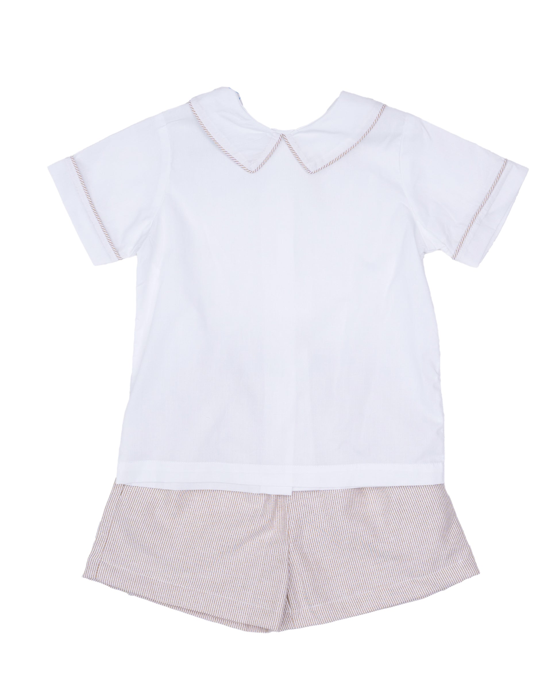 A timeless boys short set featuring a crisp white top with coordinating trim detail at the collar and sleeves. Paired with classic tan striped shorts, this traditional two-piece outfit offers a clean, polished look.