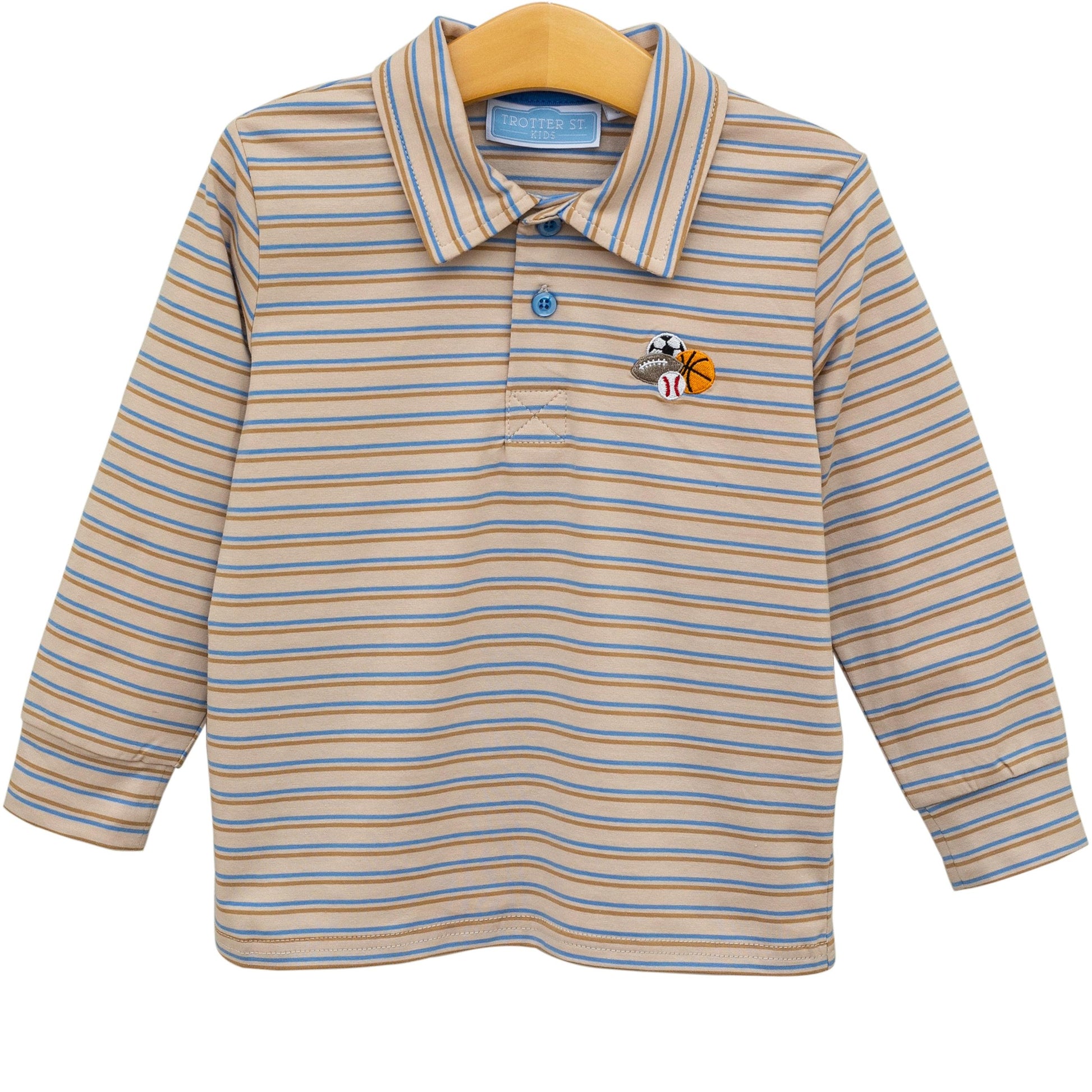 Dress your little one in sporty style with this classic long-sleeve polo! Featuring tan and blue stripes with embroidered sports ball accents, this shirt combines knit comfort and charm for everyday wear.