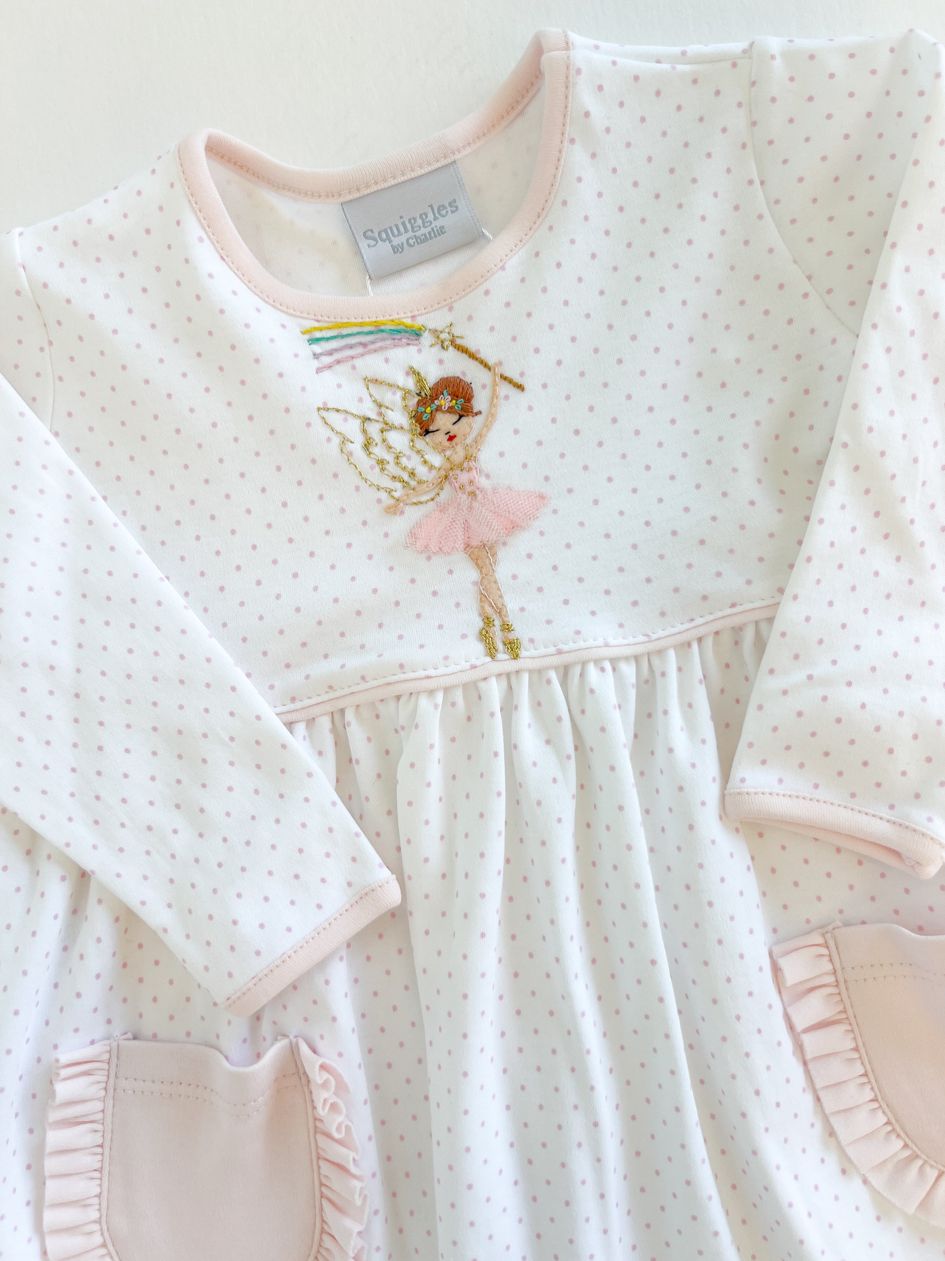 Whimsical and sweet, this long-sleeve dress features soft polka-dot knit with an embroidered ballerina swan, complete with tutu detail. Front ruffle-trimmed pockets add a charming touch—perfect for playdates, parties, or everyday twirls. 100% Pima cotton.