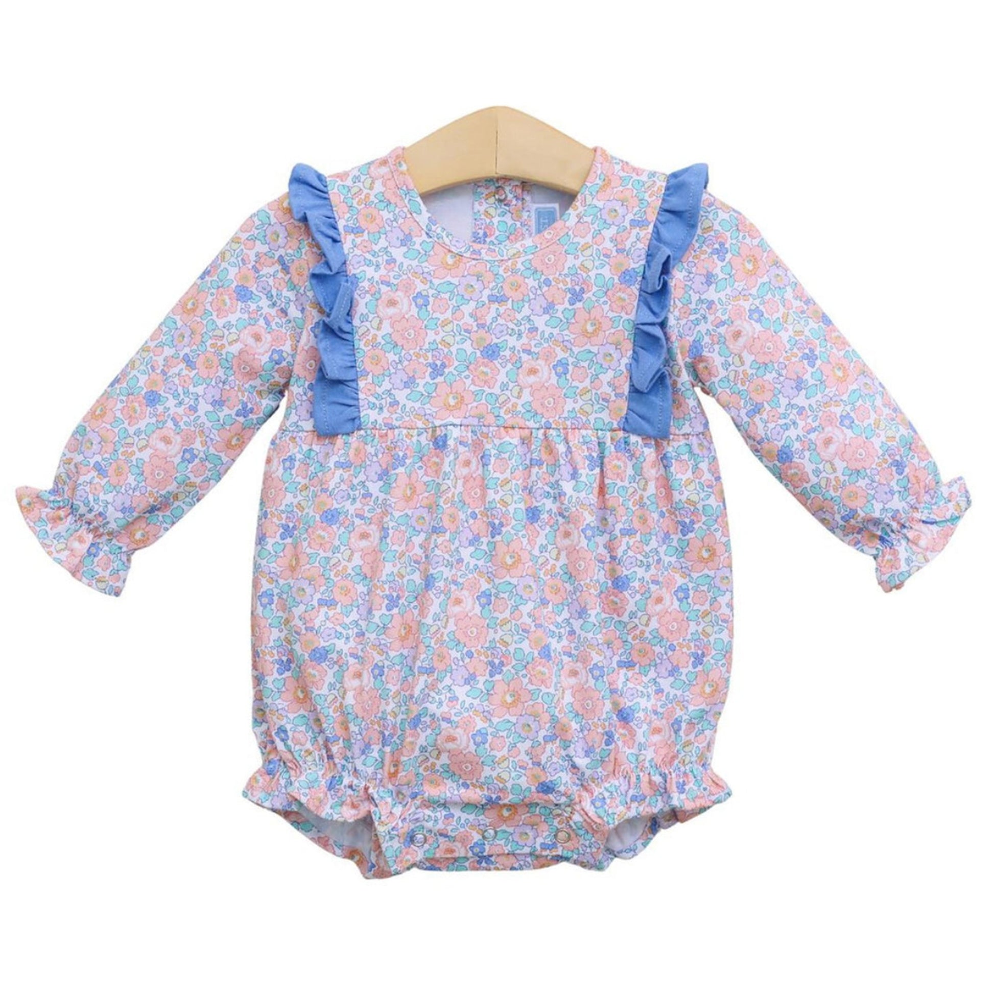 This Frankie Blue Floral Knit Bubble is the perfect outfit for any fall occasion! Whether it's church, back to school, the pumpkin patch, or a fun outing, this adorable blue floral bubble is ready for it all. It features long bishop sleeves and snaps in stride for easy changes.
