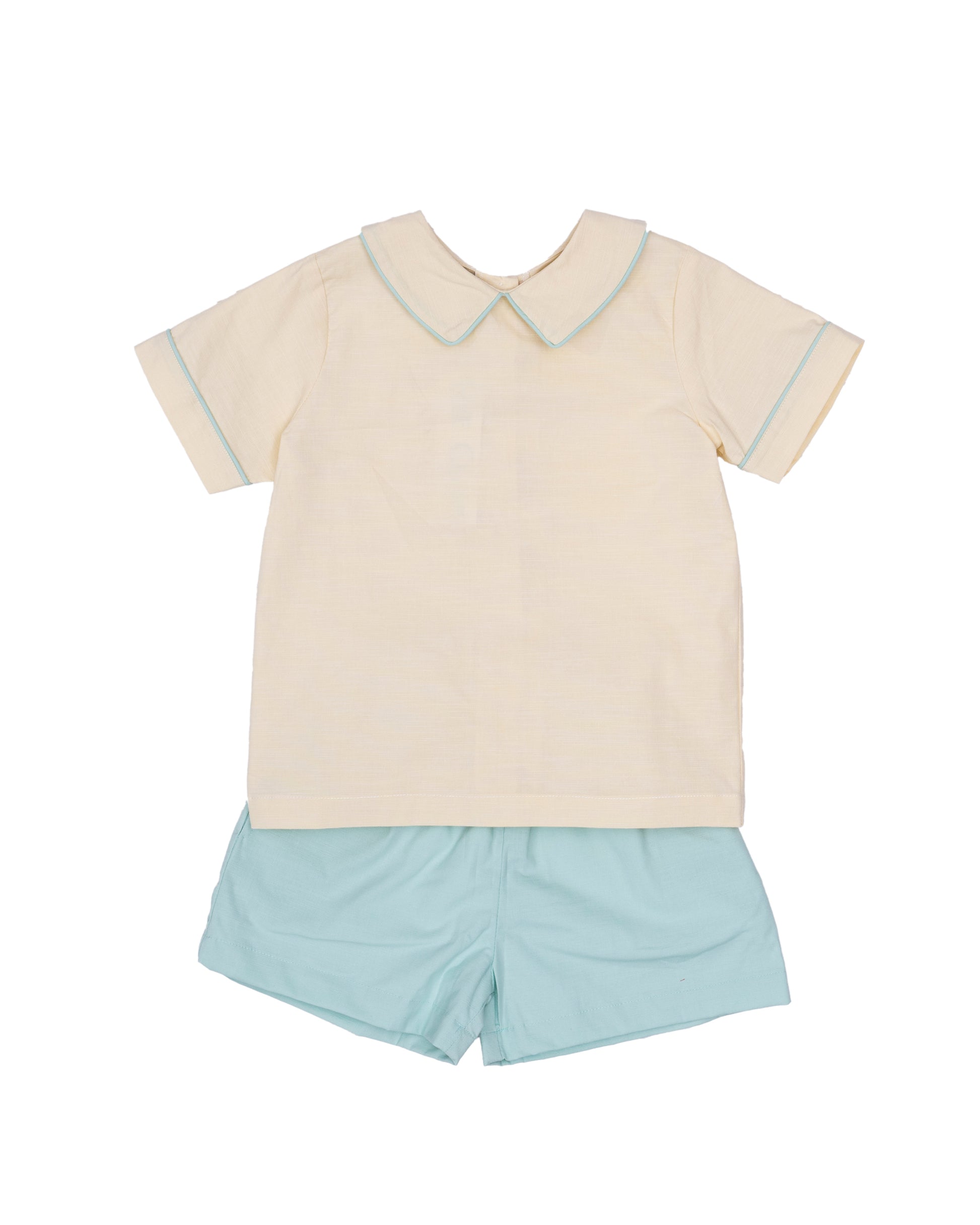 A classic boys short set featuring a soft yellow top with coordinating sea-foam piping at the collar and sleeves. Paired with matching sea-foam shorts, this timeless two-piece outfit offers a clean, traditional look.